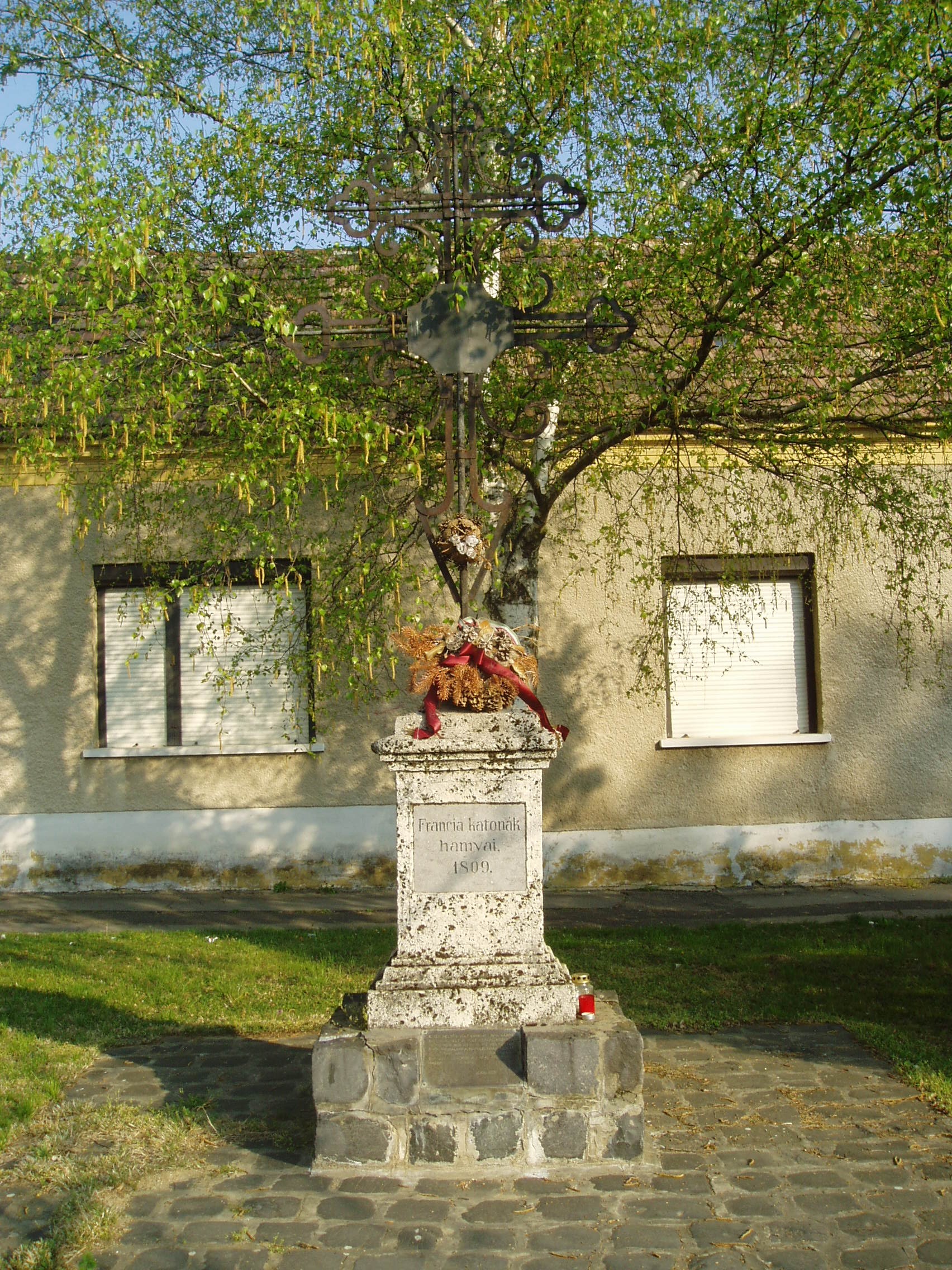 Nyilvános 1120 | 2049 | Pápa, Anna tér: Francia kereszt | Az Anna tér az egykori Alsóváros településközpontja. A tér dombján álló Szent Anna kápolna 1875-ben épült. A közelében található ún. Francia kereszt a napóleoni háború francia halottainak egykori tömegsírja felett áll. Pápát 1809. június 1. és július 6. között megszállva tartották a franciák. A hátrahagyott, majd később idehozott sebesültek ápolásáról a városnak és a megyének kellett gondoskodni. Egyes források szerint több, mint 5000 sebesültet ápoltak a városban, akik közül sokan belehaltak sérüléseikbe. Őket itt, az Anna téren temették el. Hamvaik a temető felszámolása után az Alsóvárosi temetőbe kerültek a kettős vaskereszttel együtt, amelyet 1986-ban állítottak vissza eredeti helyére. A fénykép 2007 áprilisában készült. Felh. irod.: Németh Adél - Szabó Lajos: Pápa. Bp. Panoráma, 1989 |