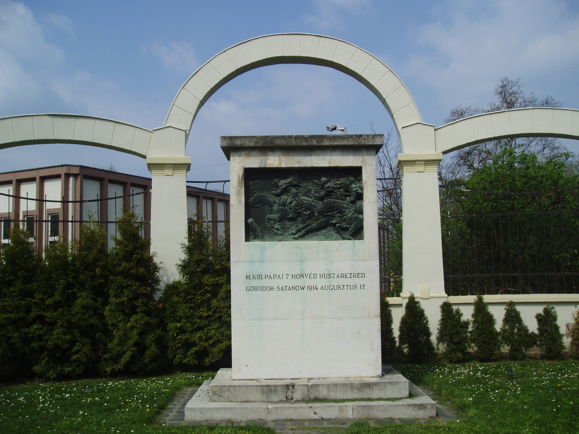 Nyilvános 1084 | 2145 | Pápa, Esterházy út: a pápai 7-es huszárok emlékműve | Az Esterházy-kastély közelében, a színház irányában áll a pápai 7-es huszárezred emlékműve. Manno Miltiades domborműve az első világháború egyik hadvezetési baklövéseként bekövetkezett tragédiát idézi: az ezred elpusztult Galíciában. A fénykép 2007 áprilisában készült. Felh. irod.: Pápa. Szerk.: Sz. Farkas Aranka. Bp., Magyar Képek, 2000 |