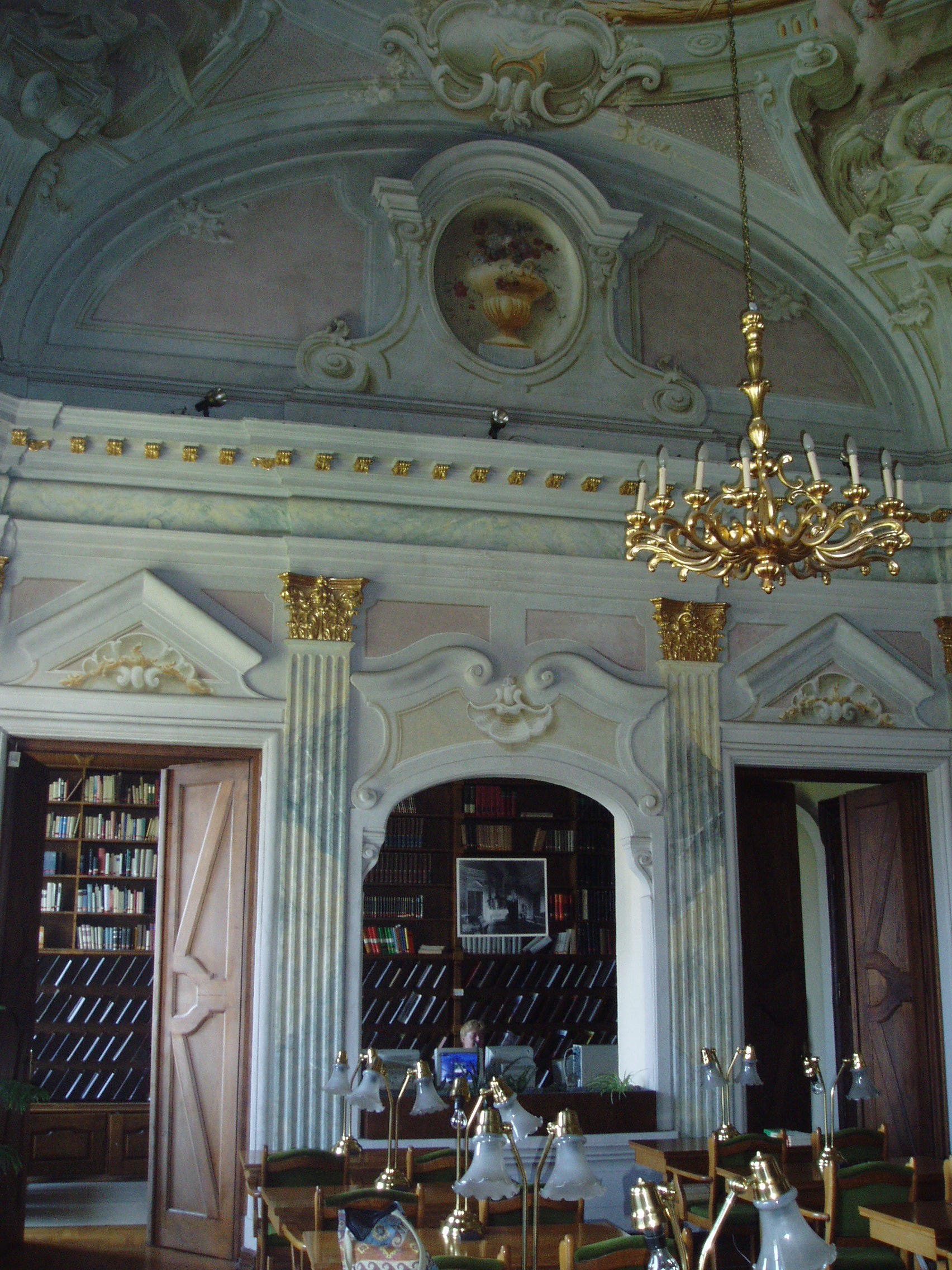 Nyilvános 1042 | 1731 | Pápa, Fő tér 1-3. Esterházy-kastély | A barokk kastély a korábban itt állott végvár helyére épült, részben annak alapfalai, kövei felhasználásával. A régi várat az 1740-es évektől Esterházy Ferenc (1683–1754) tárnokmester kezdte átalakítani Franz Anton Pilgram tervei alapján. A barokk várkastély kialakítása 1784-re fejeződött be Esterházy Ferenc fia, Eszterházy Károly egri püspök idejében Fellner Jakab, majd Grossmann József vezetésével. Az U alakú, egyemeletes épület a versailles-i palota nyomán elterjedt francia kastélytípus képviselője. Az épület keleti szárnyának emeletén volt a kastély kápolnája. Az 1988/89-ben végzett restaurálás eredményeképpen ma újra megcsodálható a helyiség eredeti architektúrája és Joseph Ignaz Mildorfer 1750 körül festett mennyezetképe, amely Krisztus mennybemenetelét ábrázolja. A kápolnában, amelynek példaszerű felújításáért a város 1990-ben Europa Nostra díjat kapott, ma a Jókai Mór Városi Könyvtár olvasóterme működik. A fénykép 2007 áprilisában készült. Felh. irod.: Németh Adél - Szabó Lajos: Pápa. Bp. Panoráma, 1989 Pápa. Szerk. Sz. Farkas Aranka. Bp., Magyar Képek, 2000 |