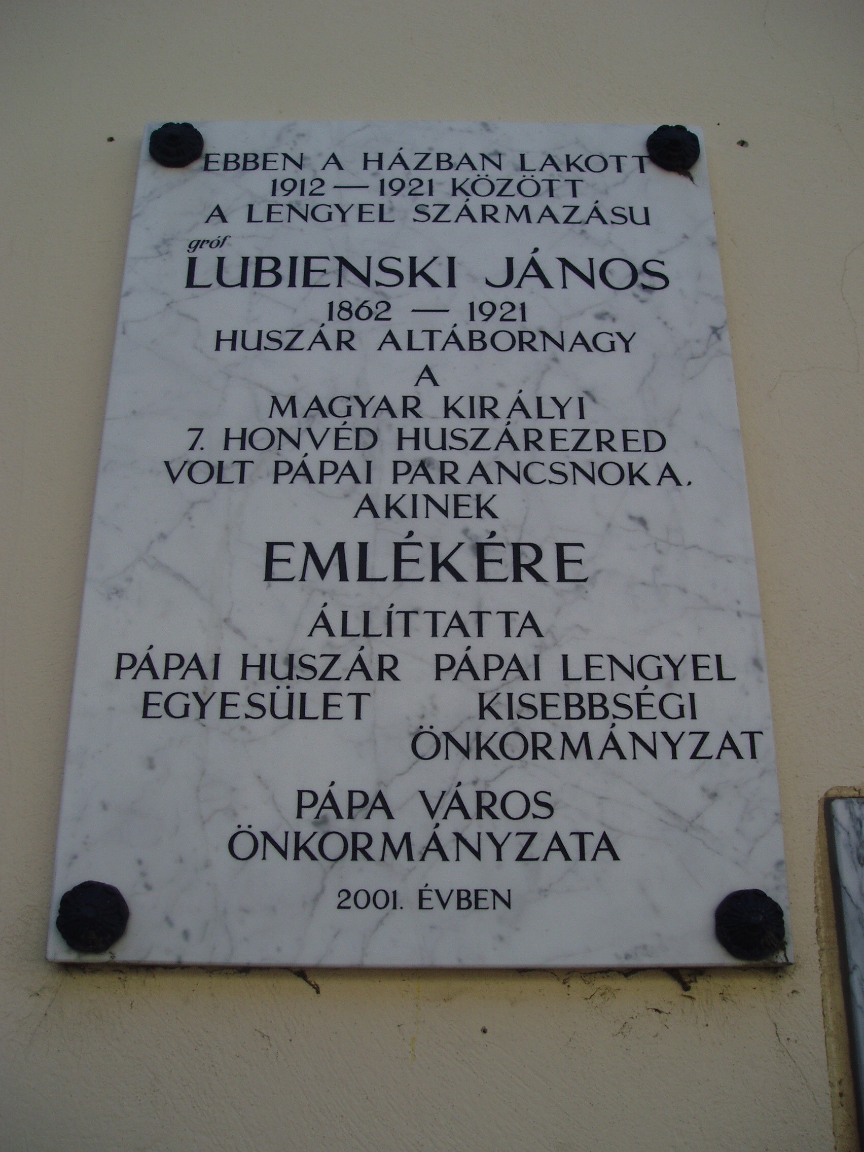 Nyilvános 1046 | 1781 | Pápa, Fő tér 21. Zichy-ház | A saroképület Korvin utca felőli oldalon 2001-ben helyezték el gróf Lubienski János (1862-1921) lengyel származású huszár altábornagy emléktábláját, aki a 7. Honvéd Huszárezred pápai parancsnoka volt, s 1912-1921 között ebben a házban lakott. Életéről és tevékenységéről Fejes Sándor írt monográfiát (Gróf Lubienski János huszár altábornagy 1862-1921. Pápa, Pápai Lengyel Kisebbségi Önkormányzat, 2002). A fénykép 2007 áprilisában készült. |