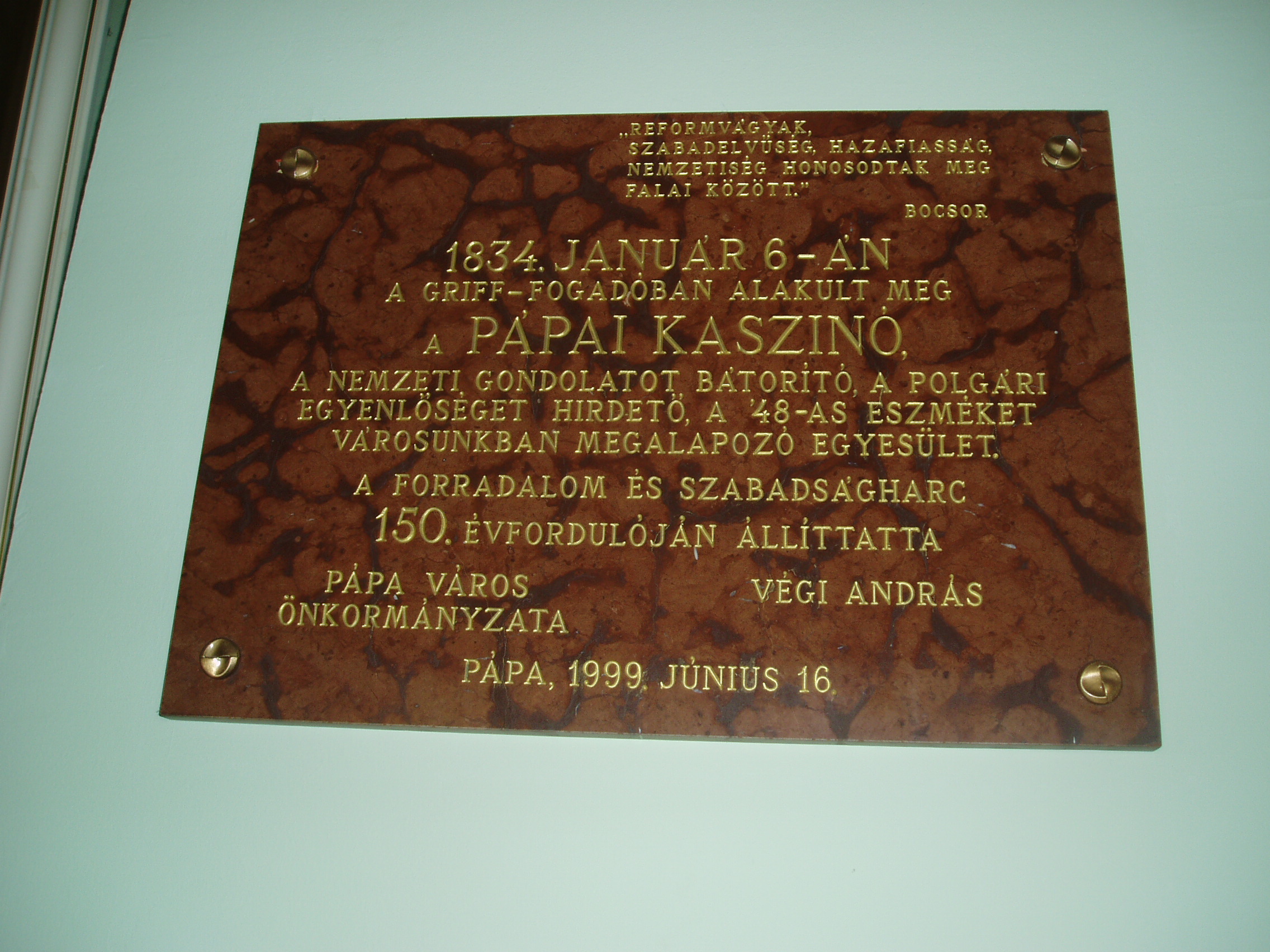 Nyilvános 1078 | 1694 | Pápa, Fő utca 15. Griff Szálló - a Kaszinó megalakulásának emléktáblája | A Fő tér és a Fő utca sarkán áll a Griff Szálló copf stílusú, 1780–1790 között emelt, 1870 körül némileg átalakított épületegyüttese. Nevét az Esterházy család címerállatáról kapta. A Fő utca felőli oldalt Kapuszínnek is nevezik, ugyanis az emelet alatti részen nyílik Pápa sétálóutcájának, a Kossuth utcának a bejárata. A ház másik része a szálloda. A XIX. század folyamán a Griff volt a pápai társas élet központja. Itt alakult meg 1834-ben, Széchenyi István kezdeményezése nyomán — az országban az elsők között — a pápai kaszinó. E jeles eseménynek 1999-ben felavatott vörös márványtábla állít emléket. A Griff ma is meglévő patinás tánctermében — az ún. Tükörteremben — egykor színielőadások és megyebálok zajlottak. Testőrtiszt korában táncolt itt leendő feleségével, Szegedy Rózával Kisfaludy Sándor. Jónéhány évtizeddel később Mikszáth Kálmán volt jelen egy itt tartott táncmulatságon, s ez az élmény inspirálta A Noszty fiú esete Tóth Marival című regényének báli jelenetét. A XIX. század legelejétől 1881-ig, a pápai kőszínház (lásd: Pápa, Március 15. tér) megépítéséig a városba érkező különböző színtársulatok — kevés kivétellel — a Griff nagytermében tartották előadásaikat. A magyar színjátszás nagy egyéniségei közül játszott itt Déryné és Kántorné is. 1842-ben a színielőadások rendszeres látogatója volt két pápai diák, akik maguk is színészi–művészi vágyakat melengettek szívükben: Petőfi Sándor és Jókai Mór (akkor még Petrovics Sándor és Jókay Móric). Petőfi már itt tapsolhatott későbbi jóbarátjának, Egressy Gábornak, aki nevezetes szerepeiben lépett fel a társulat vendégeként — többek között Hamletet és Lear királyt játszotta. A társulat vezető színésznője Szatmáryné Farkas Lujza volt, aki elbűvölte a kamasz Petőfit. Petőfi és Jókai tiszteletüket kívánták tenni a művésznőnél, akit azonban éppen egy társnőjével civakodva találtak a Griff folyosóján. Petőfi — kiábrándulva — ekkor írta meg Szín és való című költeményét, amellyel aztán két arany pályadíjat nyert. A teremben sok jeles hangversenyt is rendeztek. 1937-ben fellépett itt Bartók Béla is fiatal kamarapartnerével, Gertler Endre hegedűművésszel. E nevezetes koncert 60. évfordulóján, 1997-ben emlékhangversenyt rendeztek ugyanitt, melyen részt vett az akkor már 90 esztendős Gertler Endre is. Mindkét eseményről vörös márványtábla emlékezik meg a Tükörteremben. Felh. irod.: Pápa. Szerk. Sz. Farkas Aranka. Bp., Magyar Képek, 2000. Németh Adél – Szabó Lajos: Pápa. Bp. Panoráma, 1989 Nádasdy Lajos: A pápai kőszínház története 1817–1931. Veszprém, 1981, Veszprém megyei Tanács www.kincsestar.radio.hu/harangok "A kényes úrfi s a rongyos baka". Tanulmányok két halhatatlan pápai diákról. Pápa, Pápai Református Gyűjtemények, 2001 |