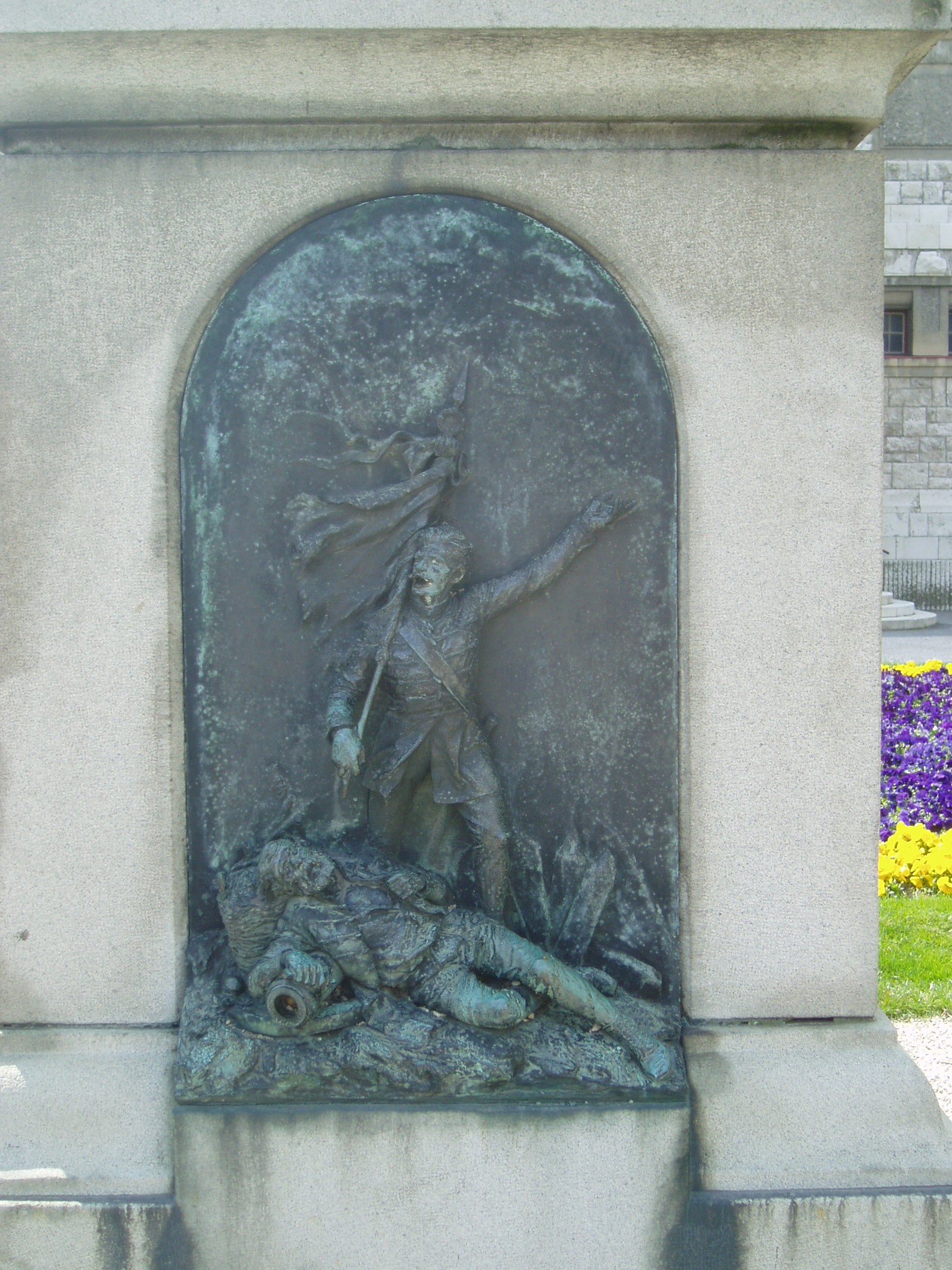 Nyilvános 1026 | 1670 | Pápa, Március 15. tér: Honvéd emlékmű | A református templom előtti kis parkban, a Jókai utca felőli oldalon álló Honvéd emlékmű ifj. Vastagh György alkotása. 1896-ban állították fel a Pápa melletti ihászi csata emlékére. A hengeres oszlopon kiterjesztett szárnyú, bronz turulmadár ül. A négyzetes talapzaton levő bronzrelief csatajelenetet ábrázol. A szabadságharc egyetlen Veszprém megyei csatája 1849. június 27-én zajlott le Ihász térségében (korábban, június 13-án Kmetty György győzelmet aratott Csornán). Június 27-én az ihászi pusztán Kmetty megtámadta a Marcaltő elfoglalására siető Schütte osztrák tábornokot. A csata nem végződött egyértelmű győzelemmel, de a magyaroknak heves ágyútűzzel sikerült hátráltatni az osztákokat. Azonban az erős osztrák lovasság Kmetty csapatait végül visszanyomta Pápa felé. A fénykép 2007 áprilisában készült. Felh. irod.: Németh Adél - Szabó Lajos: Pápa. Bp. Panoráma, 1989 |