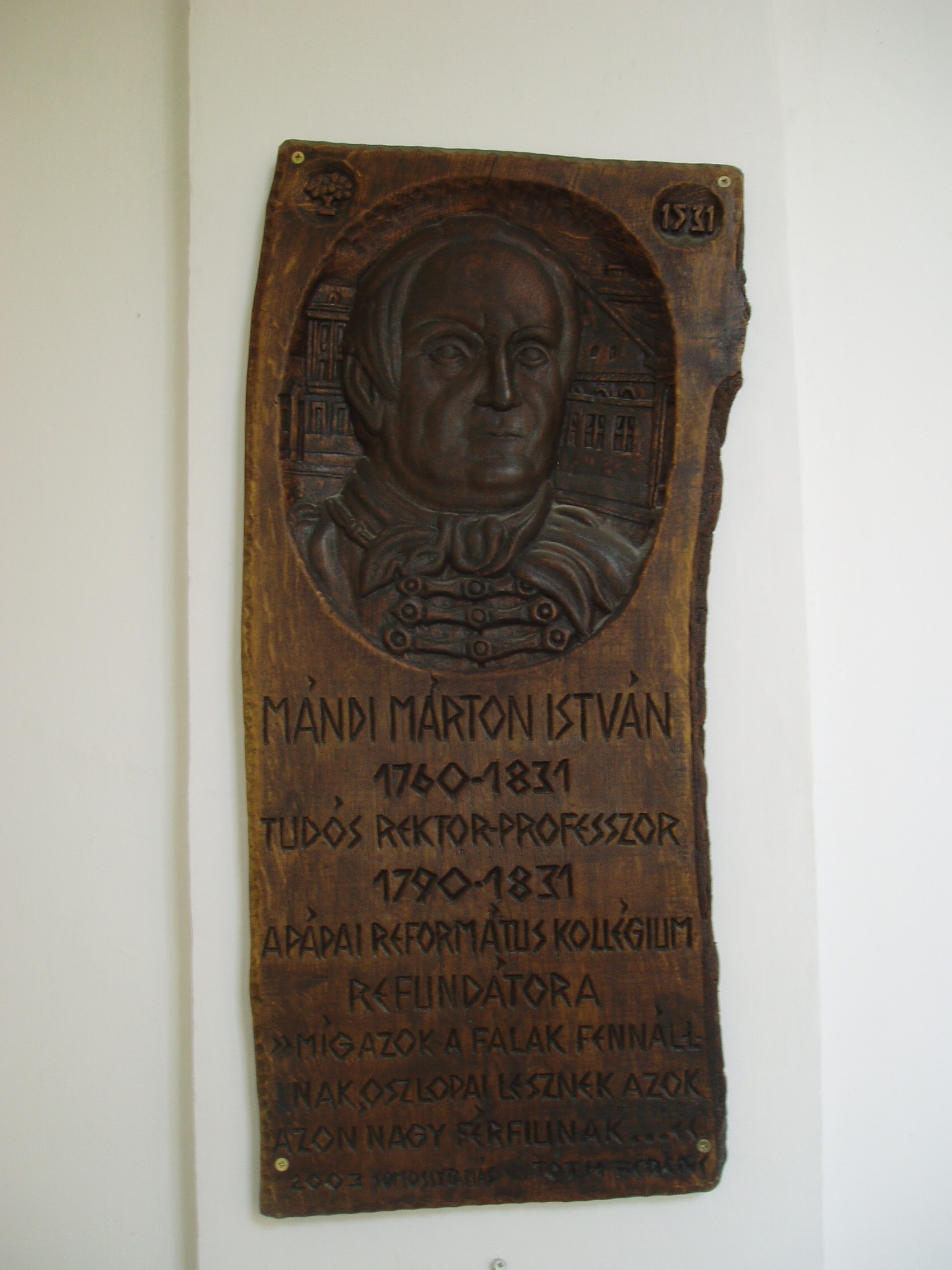 Nyilvános 1008 | 1655 | Pápa, Március 15. tér 9. Pápai Református Kollégium Gimnáziuma | A híres pápai Református Kollégium első épülete 1531 és 1752 között a mai Ruszek közben, a Lábasház épületének helyén állott. 1752-ben - Mária Terézia rendeletének következtében, amely megszüntette a szabad vallásgyakorlást - harminckét évig csak a közeli Adásztevelen működhetett. 1784-ben, II. József türelmi rendeletének köszönhetően térhetett vissza az iskola Pápára, s hamarosan felépült a ma Ókollégiumként ismert épület (lásd: Pápa, Petőfi u. 13.), amelyben 1794-ben indulhatott meg az oktatás. Az intézmény 1857-ig működött ott, ekkor átköltözött a Március 15. tér 13-15. számú házba, az ún. Nátus-ba, majd 1895-ben utolsó végleles helyére, ide, a Március 15. tér 9. számú monumentális új épületbe. Az iskola folyosóin számtalan emléktábla, szobor, dombormű idézi az egykori kiváló tanárok, jeles diákok alakját. A képen Mándi Márton István fa reliefje látható, amely Somosi Tamás munkája. Mándi Márton István (Iszkaszentgyörgy, 1760. nov. 23. – Pápa, 1831. szept. 21.) nyelvész, tanár, filozófus. Kecskeméten, Debrecenben, majd Göttingában tanult. 1790-től volt a pápai református gimnázium rektor-professzora. Nevéhez fűződik az iskola új fellendülése. A filozófiában Kant követője volt és 1795-ben már Kant tanítása alapján tartott előadásokat, amelyekért súlyos bírálat érte. Síremléke az Alsóvárosi temetőben van (lásd: Pápa, Alsóvárosi temető,: Mándi Márton István sírja); márvány mellszobra, Izsó Miklós alkotása a református könyvtárban látható. A fénykép 2007 áprilisában készült. Felh. irod.: Németh Adél - Szabó Lajos: Pápa. Bp. Panoráma, 1989 http://refi-papa.hu |