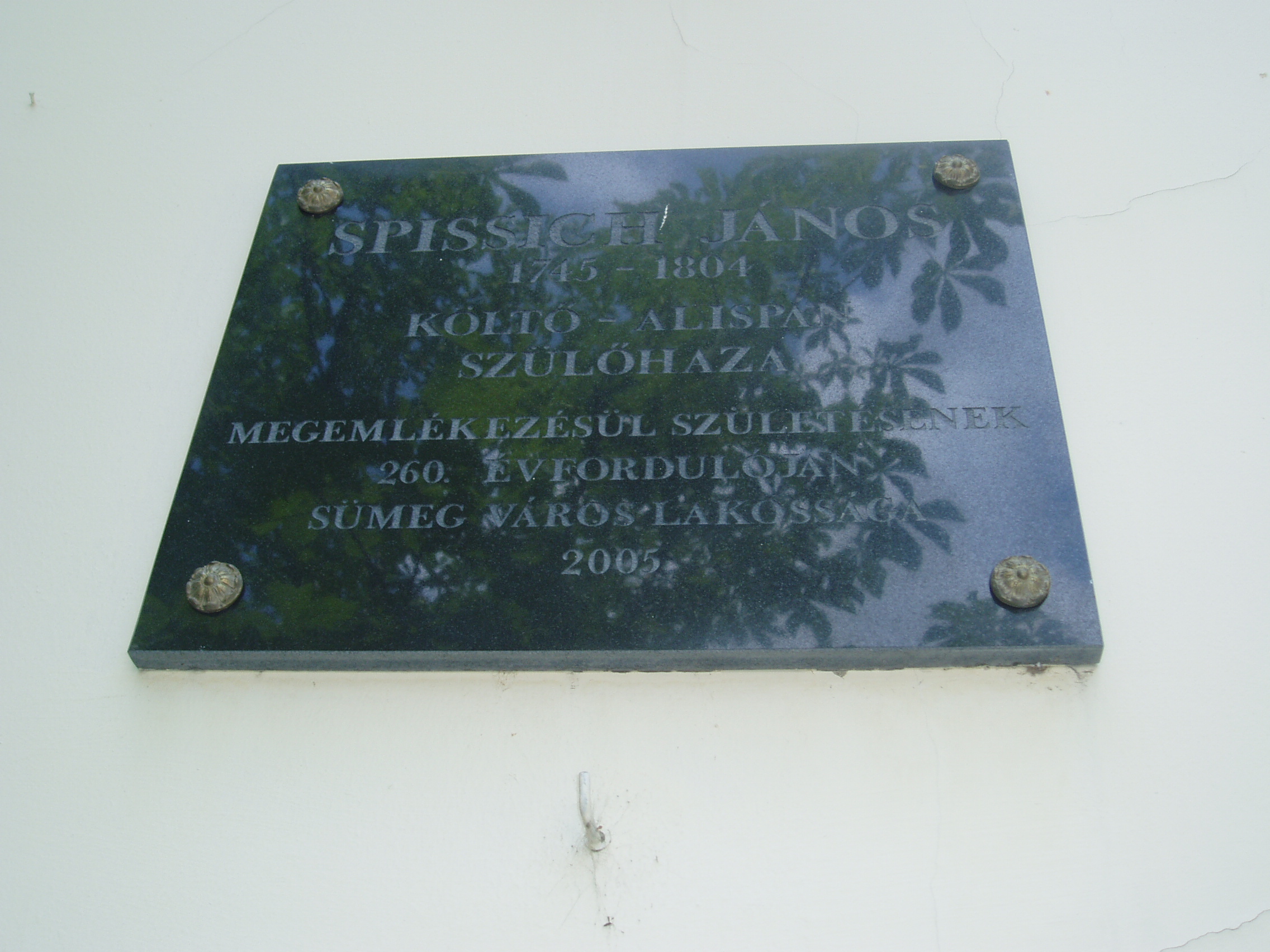 Nyilvános 1018 | 1596 | Sümeg, Deák F. u. 6. | Mint a homlokzaton elhelyezett emléktáblán is olvasható, ebben a házban születetett 1745-ben Spissich János költő-alispán. Spissich János (Sümeg, 1745. márc. 28 – Kisgörbő, 1804. ápr. 25.) költő, alispán. Régi horvát nemesi családból származott. Apja Sopron megyei szolgabíró. 1761-ben Trencsében lépett a jezsuita rendbe, Kőszegen, Gyöngyösön, Komáromban tanított. 1771-ben megvált a rendtől, Zala vármegyében aljegyző, 1780-tól főjegyző. 1781-től az Eltz-uradalom (Szlavónia) jószágkormányzója, majd Zala megyei alispán, 1790–1791-ben országgyűlési követ. A francia forradalommal rokonszenvező ellenzéki magatartása miatt kegyvesztetté vált. József nádor vizsgálatot rendelt el ellene, de tisztázni tudta magát. 1797. ápr. 12-i zalai megyegyűlés elmozdította az alispánságból, 1798-tól kisgörbői birtokán élt. Szabadkőműves, a zalaegerszegi nagypáholy vezetője. Baráti viszonyban volt Kazinczyval, Pálóczi Horváthtal. Jelen volt Széchényi Ferencnél tartott ülésen, amelyen a tudós társaság felállítását tervezték. Versei közül A jövendő századnak c. emelkedik ki. Beszélt a magyaron kívül olasz, német, latin, szláv és orosz nyelven. A fénykép 2007 júniusában készült. Felh. irod.: Veszprém megyei életrajzi lexikon. Veszprém, 1998 |