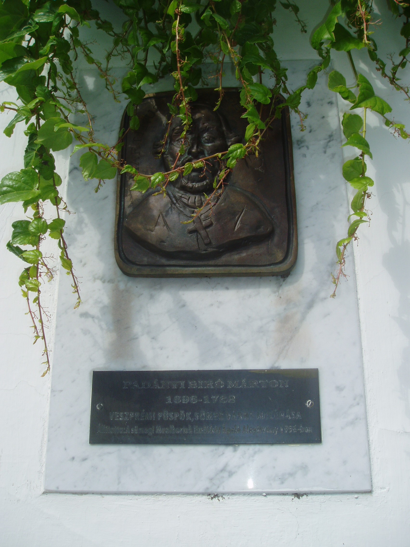 Nyilvános 1043 | 1532 | Sümeg, Panteonfal. Padányi Bíró Márton emléktáblája | A Kisfaludy téren, Kisfaludy Sándor szülőháza előtt alakították ki Sümeg Panteonfalát. A képen Padányi Bíró Márton emléktáblája látható, Máger Ágnes alkotása (1996). Felirata: PADÁNYI BIRÓ MÁRTON, 1696-1762, veszprémi püspök, Sümeg város mecénása Padányi Bíró Márton (Padány, 1696. ápr. 15. – Sümeg, 1762. aug. 10.) író, püspök, főispán. 1729-ben nevezték ki veszprémi kanonokká és felsőörsi préposttá. 1745. márciusától a veszprémi egyházmegye püspöke és a megye főispánja. A káptalannal és a várossal sokat hadakozott, ezért szívesebben tartózkodott Sümegen, ahol megépíttette a ma is álló püspöki palotát (lásd: Sümeg, Szent István tér 10.) és a plébániatemplomot (lásd: Sümeg, Bíró M. u. 1.). Püspöki tevékenységét az egyházmegye látogatásával kezdte, amelynek anyaga 10 hatalmas kötetet tesz ki. Templomok, és iskolák tucatjait építtette vagy állíttatta helyre, amelyeknek jelentős részét a protestánsoktól, nem egy esetben erőszakos, hatalmi eszközökkel szerezte vissza. Az államhatalomnak az eretnekekkel szembeni kötelességeit fejtette ki az Enchiridion de fide c. munkájában, amely 1750-ben jelent meg. A könyv, vallási türelmetlensége miatt nagy vihart kavart, nemzetközi tiltakozásra a királynő elkoboztatta. Nagyvonalúan támogatott írókat műveik kiadásában, művészeket az alkotásban. Maga is sokat írt. Sümegen a plébániatemplom előtt áll bronz mellszobra, Marton László alkotása. A veszprémi székesegyház altemplomában nyugszik. A fénykép 2007 júniusában készült. Felh. irod.: Koppány Tibor - Kozák Károly: Sümeg útikalauz. Veszprém, Idegenforgalmi Hivatal, 1965 Látnivalók Veszprém megyében. Miskolc, Well-PRess, 2004 Veszprém megyei életrajzi lexikon. Veszprém, Veszprém Megyei Önkormányzat Közgyűlése, 1998 www.ekmk.hu/emlekhely/Emlekhelyek.html |