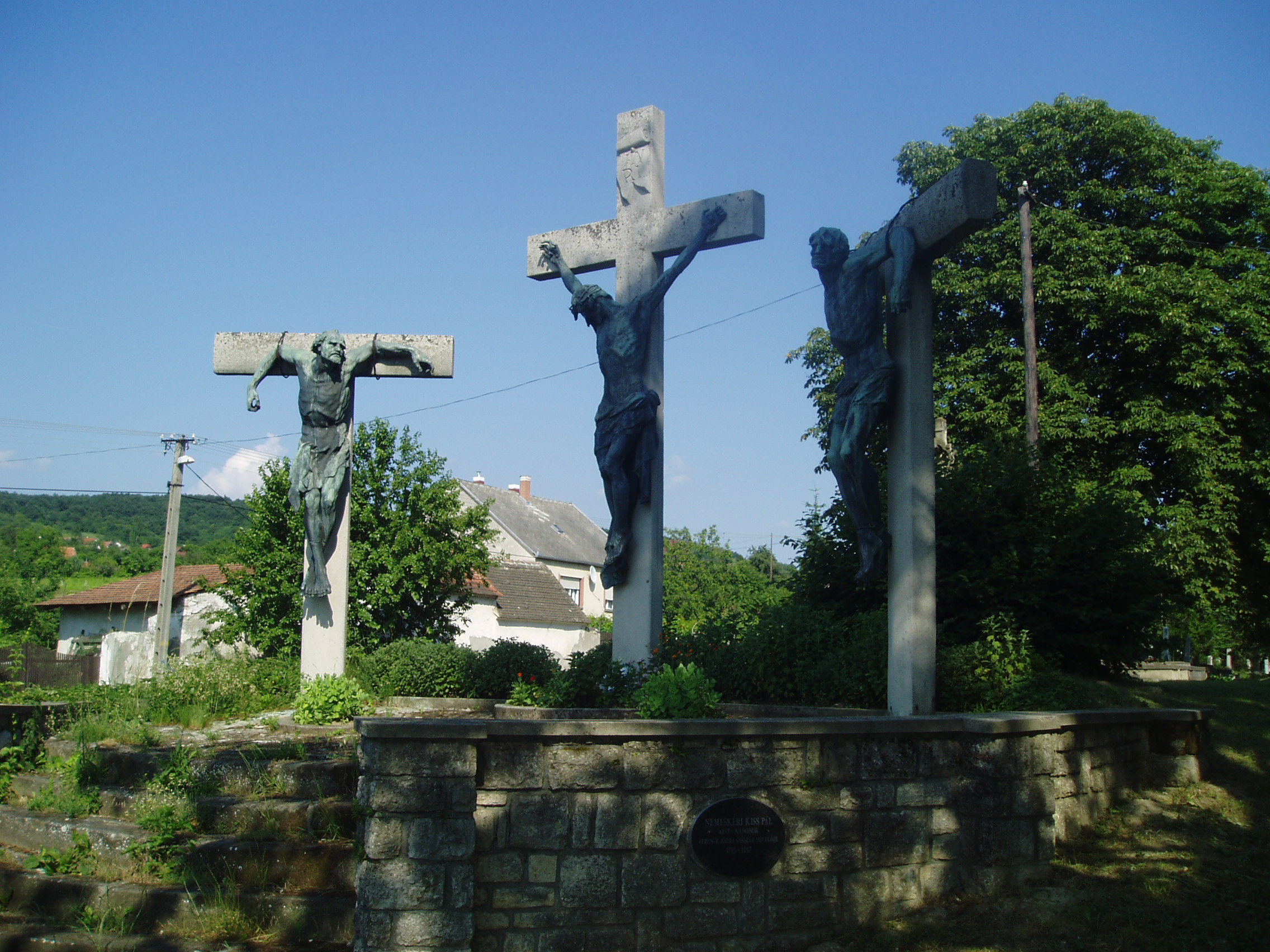 Nyilvános 1045 | 2934 | Sümeg, Temető. Kálvária csoport | Sümeg délkeleti határában, a Tapolcára vezető út mellett emelkedő lankás domboldalon találjuk a város köztemetőjét. Helyét még Bíró Márton püspök jelölte ki; jelentősebb számban a XIX. század eleje óta kezdtek ide temetkezni. A temetődomb tetején áll az 1816-ban épített, későbarokk stílusú temetőkápolna. (Sajnos, nem tudtam lefényképezni, nyáron a körülötte álló fák lombjai szinte teljesen eltakarják - K.K.) Körülötte a sümegi élet utolsó két évszázada szinte valamennyi híres személyiségének sírja fellelhető. A kápolna mellett Siklódy Lőrinc kimagasló művészi értéket képviselő Kálvária szoborcsoportja látható. Az 1926-ban készült, a keresztre feszített Krisztust és a két latort ábrázoló szoborkompozíciót eredetileg Tihanyban állították fel IV. Károly magyar király emlékére. 1960-ban kerültek ide, így sikerült megóvni őket a megsemmisítéstől. A fénykép 2007 júniusában készült. Felh. irod.: Sümegi kalauz. Sümeg, Sümegi Fórum Alapítvány, 1993 Miklósi-Sikes Csaba: Kőbe vésett történelem. A sümegi városi temetők története és sírjelei 1950-ig. Sümeg, Sümegi Fórum Alapítvány, 2002 |