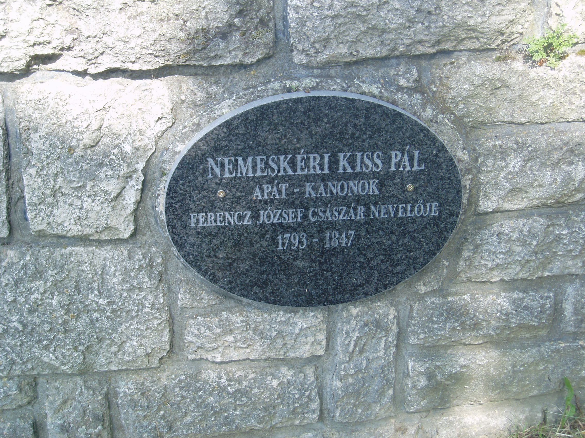 Nyilvános 1056 | 2112 | Sümeg, Temető. Nemeskéri Kiss Pál sírja | Sümeg délkeleti határában, a Tapolcára vezető út mellett emelkedő lankás domboldalon találjuk a város köztemetőjét. Helyét még Bíró Márton püspök jelölte ki; jelentősebb számban a XIX. század eleje óta kezdtek ide temetkezni. A temetődomb tetején áll az 1816-ban épített, későbarokk stílusú temetőkápolna. Körülötte a sümegi élet utolsó két évszázada szinte valamennyi híres személyiségének sírja fellelhető. Nemeskéri Kiss Pál (1793-1847) ovális alakú sírfelirata a temetőkápolna melletti Kálvária oldalában befalazva található. Eredeti sírja a család itteni kriptájában volt, amelyet beépítettek a Tihanyból 1968-ban ide áttelepített Kálvária-szoborcsoport talapzatába. Nemeskéri Kiss Pált Győrben szentelték pappá. Az 1820-as évektől a bécsi Theresiánumban a magyar nyelv és irodalom tanára volt, magyar nyelvre tanította Ferenc Károly főherceg fiait, köztük Ferenc Józsefet, a leendő osztrák császárt és magyar királyt. 1840-ben nagyváradi kanonoknak, 1843-ban királyházi apátnak nevezték ki. A Magyar Tudományos Akadémia 1846-ban tiszteletbeli tagjának választotta. Kívánsága szerint temették el a sümegi családi kriptában. Néhány évvel halála előtt a még gyerek Ferenc József testvéreivel, Károly Lajossal és a később Mexikóban kivégzett Miksával látogatást tett Sümegen egykori tanáránál. A fénykép 2007 júniusában készült. Felh. irod.: Koppány Tibor - Kozák Károly: Sümeg útikalauz. Veszprém, Idegenforgalmi Hivatal, 1965 Sümegi kalauz. Sümeg, Sümegi Fórum Alapítvány, 1993 Miklósi-Sikes Csaba: Kőbe vésett történelem. A sümegi városi temetők története és sírjelei 1950-ig. Sümeg, Sümegi Fórum Alapítvány, 2002 Veszprém megyei életrajzi lexikon. Veszprém, Veszprém Megyei Önkormányzat Közgyűlése, 1998 |