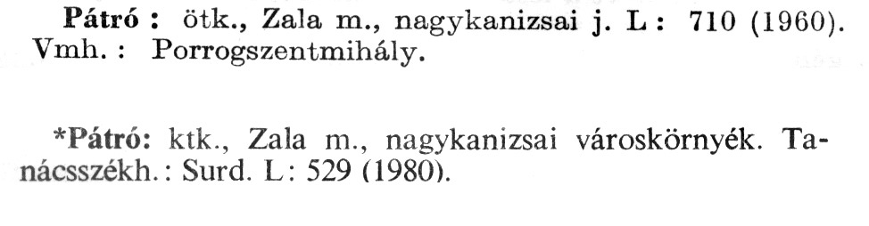 Nyilvános 1922 | 5909 | A szócikkek felismertetett szövege: | (A csillag után az 1981-es kiadású kiegészítő kötetből származó szöveg következik) Pátró: ötk., Zala m., nagykanizsai j. L : 710 (1960). Vmh.: Porrogszentmihály. *Pátró: ktk., Zala m., nagykanizsai városkörnyék. Tanácsszékh.: Surd. L: 529 (1980). A szócikkek a következő lexikonból származnak: Cím: Új magyar lexikon Közreműködő: Berei Andor (1900-1979) (szerk.) Szerz. közl.: [szerk. Berei Andor et al.] Kiadás jelzés: 2. lny. Kiadás: Budapest : Akad. K., 1961-1962 Kötetei: 1., A - C 2., D - F 3., G - J 4., K - Me 5., Mf - R 6., S - Z 7. köt., A-Z Kiegészítő kötet (1972) Kiegészítő kötet, 1962÷1980 (1981) ETO jelzet: 03=945.11 Szakjelzet: 030 Cutter: U 28 Nyelv: magyar Megjegyzés: Bibliogr. a címszavak egy részének végén |