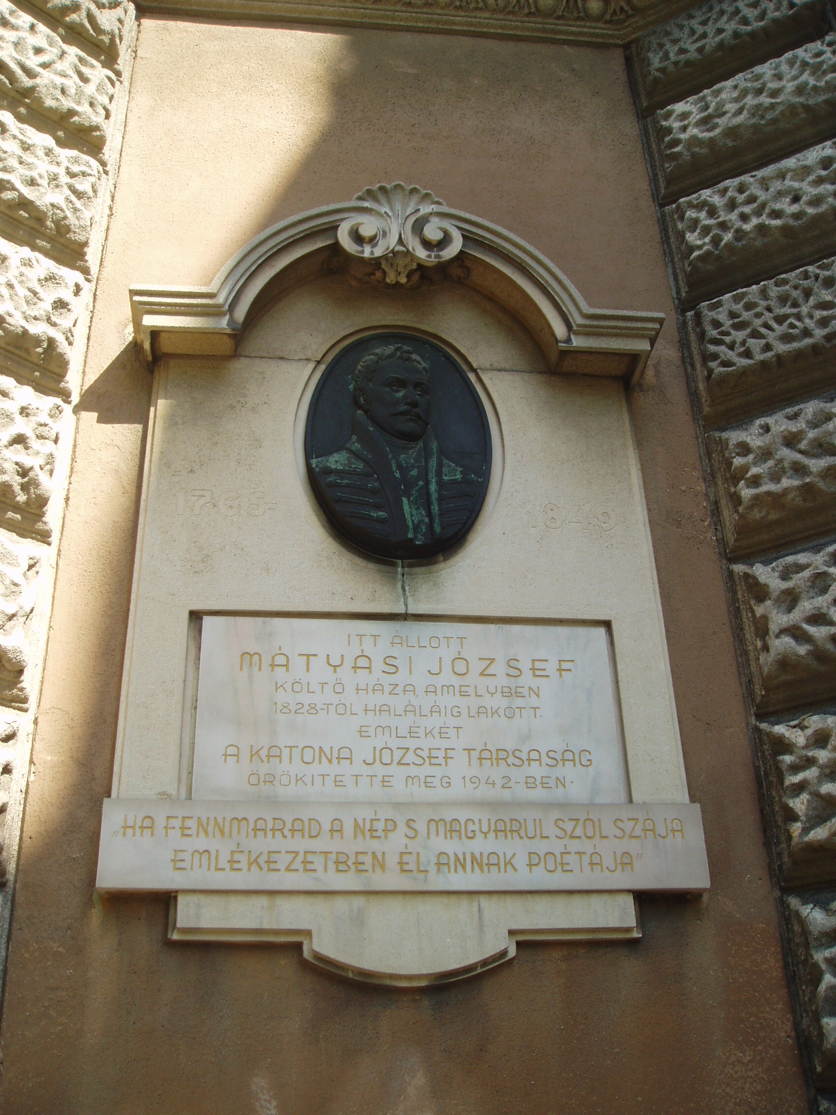 Nyilvános 1130 | 1789 | Kecskemét, Rákóczi út 7. | A bíróság épületének a keresztutca felőli részén egykor Mátyási József költő (1765-1849) "viskói uradalma" állt. Beigazolódott jövendölését vésték az őt idéző márványtáblára: "Ha fennmarad a nép s magyarul szól szája, emlékezetében él annak poétája." 1795-ben ezen a helyen Mátyási Józsefet meglátogatta Csokonai Vitéz Mihály, aki így méltatta az izsáki születésű költőt: Ezért is sok hálát nyer tőlem Kecskemét, Hogy kinek eddig is tiszteltem érdemét, Mátyási barátom s bátyám Apollóba! Veled ő állított legelőször szóba. Az ügyvédi képzettségű Mátyási József Teleki József gróf és Galánthai Fekete János generális titkáraként ismerkedett meg a francia felvilágosodás nagyjainak műveivel és fogadta el eszméiket. Joggal tartják az első felvilágosult magyar polgárnak. Már életében több kötete jelent meg, irodalmi munkásságáért Kecskemét magisztrátusa polgárjoggal, adómentességgel tisztelte meg. Sírja a városi köztemetőben van (lásd: Kecskemét, Béke fasor 71A). A fénykép 2006 augusztusában készült. Felh. irod.: Heltai Nándor: Kecskemét. Kecskeméti Lapok, 1998 |