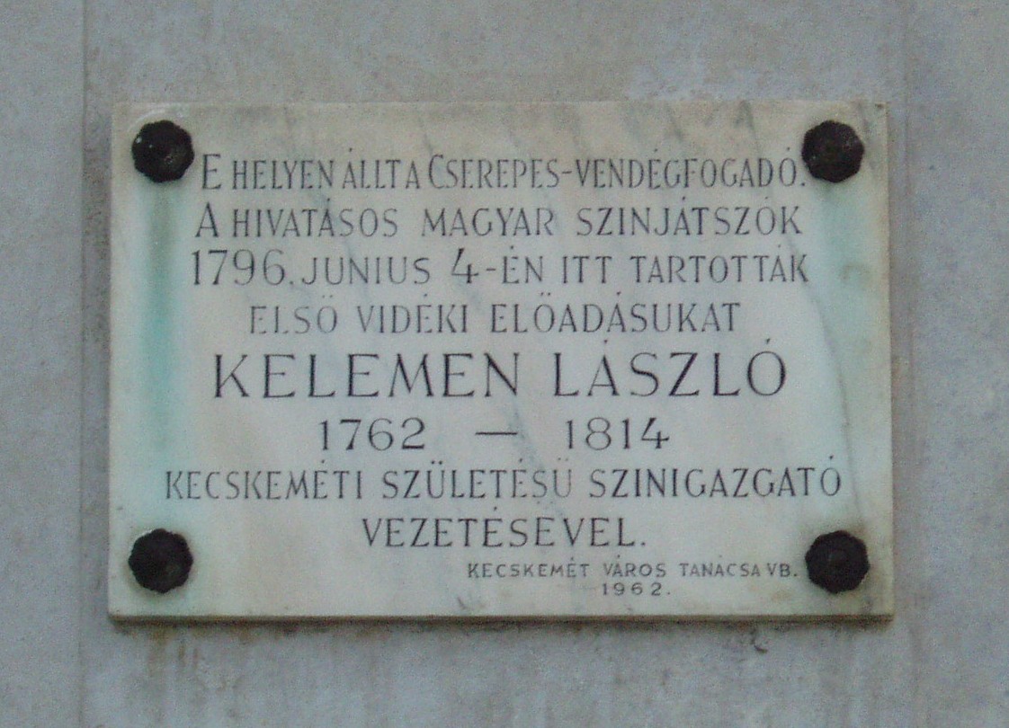 Nyilvános 1135 | 1976 | Kecskemét, Piaristák tere 7. | Az 1950-ben épült kocka alakú, háromszintes SZTK rendelőintézet helyén az 1773–1776 között épített Arany Sas vendégfogadó állott, amelyet a kecskemétiek csak Cserepes néven emlegettek. Udvari fészerében a XVIII. század legvégén alkalmi színpadot alakítottak ki, itt szerepeltek először a városban hivatásos magyar színjátszók, az Első Magyar Játékszíni Társaság. Vezetőjük a kecskeméti születésű Kelemen László volt. Kelemen Lászlóék első kecskeméti előadását Liszka Béla helybeli főreáliskolai tanár keltezte 1796-ra. Újabb vélemények szerint azonban az első hivatásos magyar nyelvű színtársulat csak 1800 nyarán lépett fel Kecskeméten. 1800-ban még Kelemen társulatának tagja volt a szintén kecskeméti születésű és az 1780-as években a piarista gimnáziumban (lásd: Kecskemét, Jókai u. 1.) diákoskodott Szerelemhegyi András, aki színészként és/vagy zenei mindenesként valószínűleg közreműködött a „Cserepes” udvarán megtartott előadásokon. Az Arany Sas fogadóban kecskeméti tanulmányainak megkezdésekor megszállt Jókai Mór, 1857-es országjárása idején pedig Ferenc József és felesége, Erzsébet királyné. Később az épület járásbíróság, majd kórház lett. 1948-ban lebontották s két év múlva emelték helyére a ma is álló épületet. A rendelőintézet Piaristák terére néző falán 1962-ben emléktáblát helyeztek el. A fénykép 2006 augusztusában készült. Felh. irod.: Heltai Nándor: Kecskemét. Kecskeméti Lapok, 1998 Bács-Kiskun megyei történeti és kegyeleti emlékhelyek számbavétele. Kecskemét, 1989. Birck Edit: A Duna–Tisza köze irodalmi országútjain. = Honismeret 2001. 3. |