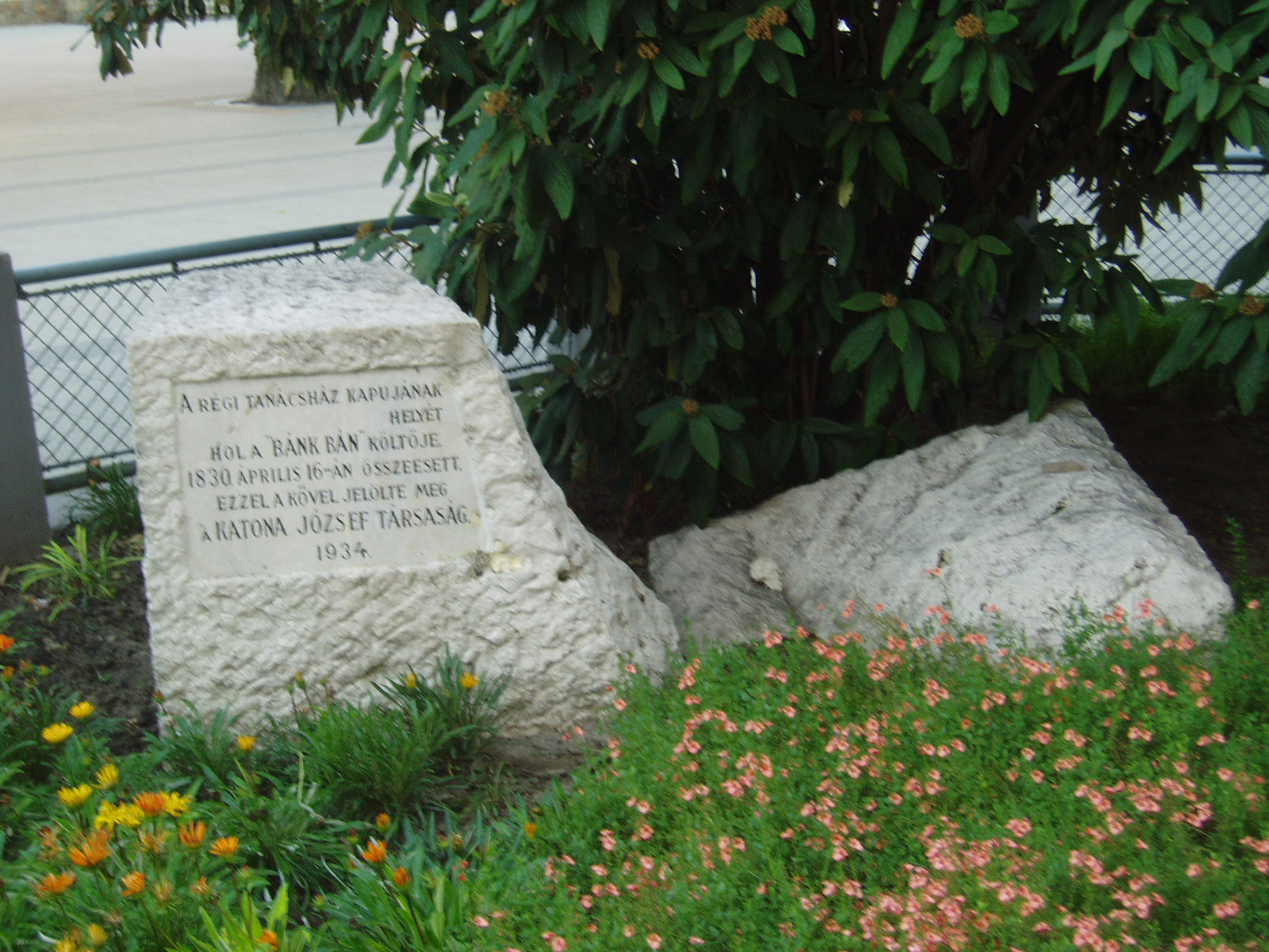 Nyilvános 1085 | 1744 | Kecskemét, Kossuth tér 1. | A szecessziós stílusú városháza 1892-1896 között épült Lechner Ödön és Pártos Gyula tervei szerint. Helyén egykor a régi városháza állott, ott dolgozott Katona József, mint városi ügyész, majd főügyész. Egy zsúfolt délelőtt után, miután megebédelt, egy kollégájával beszélgetve visszafelé tartott hivatalába, amikor a belső folyosón összeesett és szívszélhűdésben elhunyt. Halálának helyén, amely a mai épület előtt található, emlékkövet helyeztek el 1934-ben a következő szöveggel: "Itt hasadt meg a szíve Kecskemét legnagyobb fiának". A fénykép 2006 augusztusában készült. Felh. irod.: Heltai Nándor: Kecskemét. Kecskeméti Lapok, 1998 |