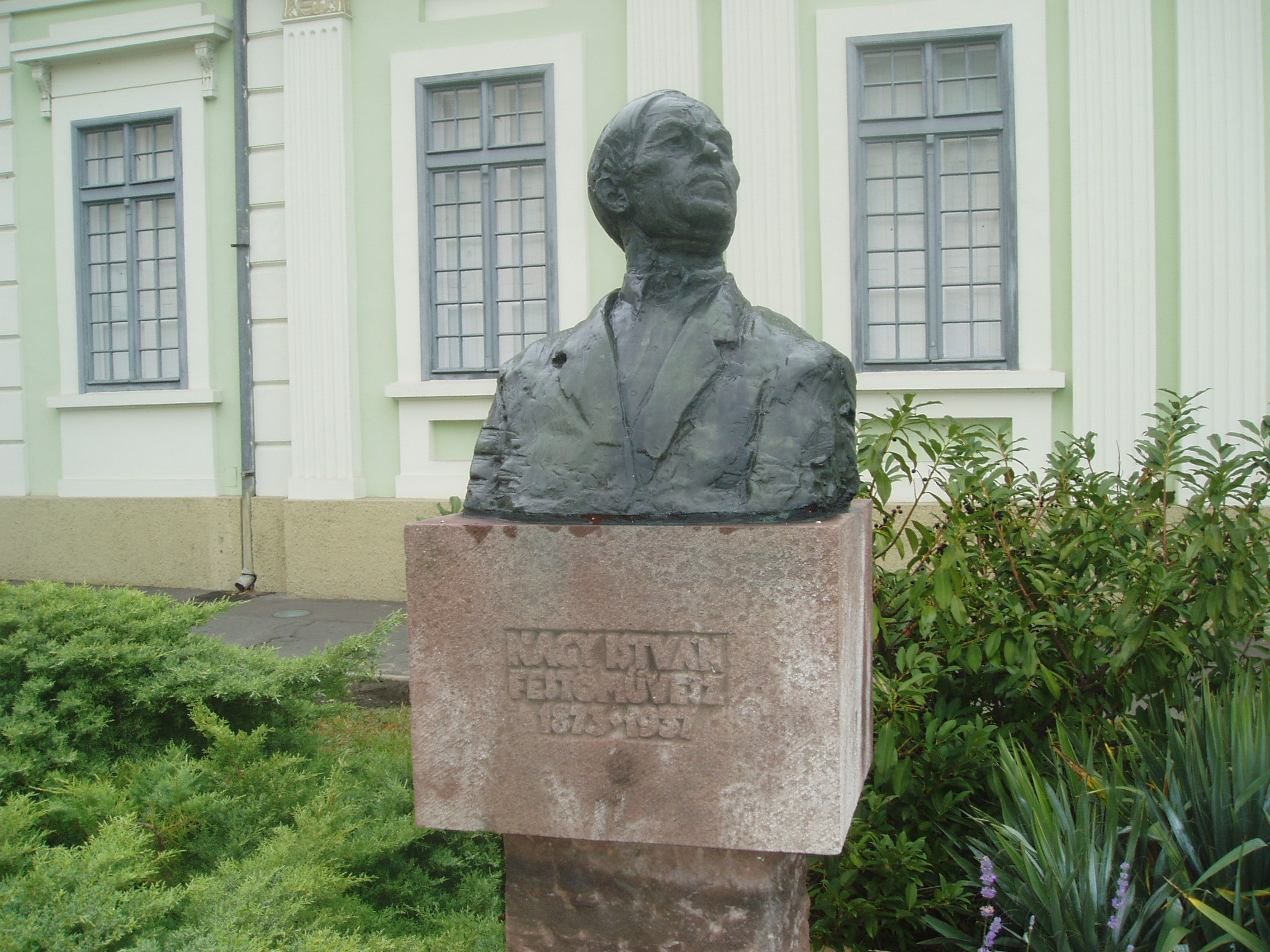 Nyilvános 1595 | 3294 | Baja, Arany János utca 1. | Az egykori Vojnich-kúria 1820 körül épült klasszicista stílusban. 1946 és 1953 között ez az épület adott otthont a Rudnay Gyulának és az általa vezetett művésztelepnek. A kúria ma a Nagy István Baján élt (lásd: Baja, Nagy István u. 8.) festőről elnevezett képtár otthona. Az épület előtti teret Nagy István bronz mellszobra, Varga Imre alkotása díszíti. A fénykép 2007 októberében készült. Felh. irod.: Látnivalók Bács-Kiskun megyében. Miskolc, Well-PRess, 2002 |