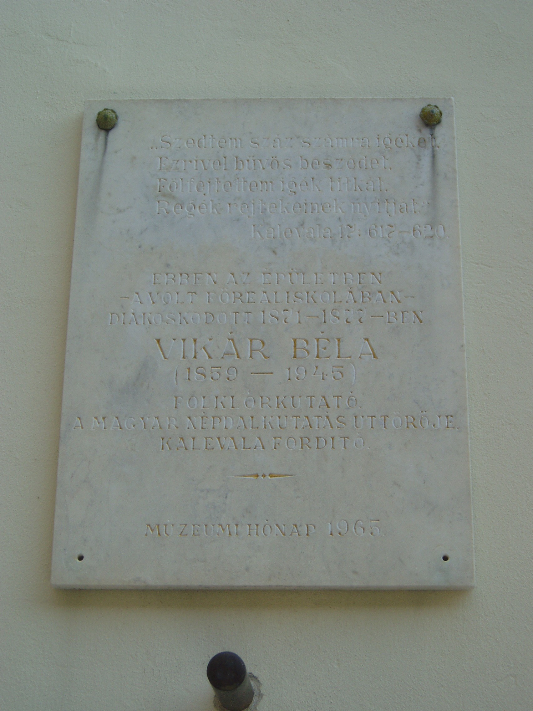 Nyilvános 1040 | 1642 | Pécs, Mátyás király utca 15. | Egyemeletes, mai állapotában kora eklektikus épület. Egykori barokk külsejére már csak a kapuja felett lévő címer — Klimó püspök címere — utal. 1743-ban apácazárdának épült, majd főreáliskola, polgári fiúiskola, zeneiskola és zenekonzervatórium lett. Ide járt iskolába 1871-77 között Vikár Béla. A Kalevala kiváló fordítójára az épületen elhelyezett tábla emlékezik. A fénykép 2006. júliusában készült. Felh. irod.: Csorba Csaba: Pécs. Bp. Panoráma, 1983 Takáts Gyula: Vikár Béla emléktáblájánál. = T. Gy.: Egy kertre emlékezve. Bp. 1971, Szépirodalmi Kiadó |