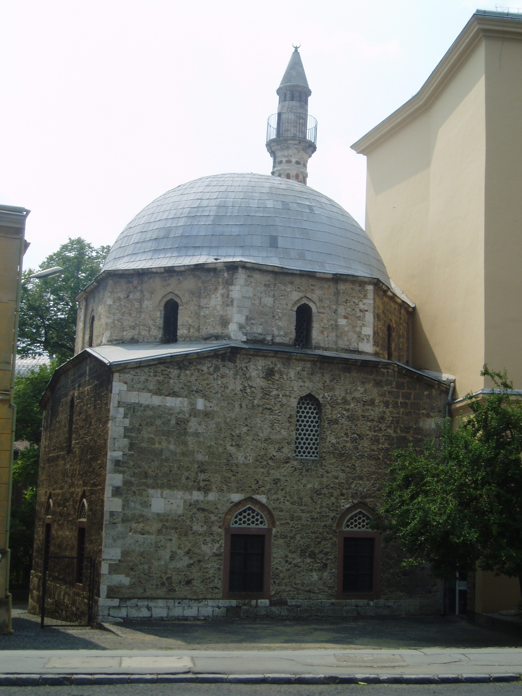 Nyilvános 1068 | 1610 | Pécs, Rákóczi út 2. Jakováli Hasszán pasa dzsámija | A Rákóczi út és a Garay utca által határolt háromszögben, a Rákóczi útról megközelíthetően áll Jakováli Hasszán pasa dzsámija és a hozzá épült minaret. A XVI. század második felében emelt épületegyüttes a legépebben álló magyarországi török templom. A négyzet alaprajzú dzsámi kupolája kívül nyolcszögű, belül kör keresztmetszetű dobon ül. Az épület falát szimmetrikusan elhelyezkedő szamárhátíves ablakok tagolják. A dzsámi a belső terében kiállított tárgyak révén, amelyek a Török Köztársaság kormányának ajándékai, egy működő török templom térélményét nyújtja. Falán néhány helyen sikerült feltárni az eredeti falfestést. A műemlék ma múzeumként látogatható. Falitárlókban török fegyverek, kerámiák, díszes rézedények, textilek tekinthetők meg, tablók mutatják be a török–magyar harcokat és Mohamed próféta életét. A fénykép 2006 júliusában készült. Csorba Csaba: Pécs. Bp. Panoráma, 1983 |