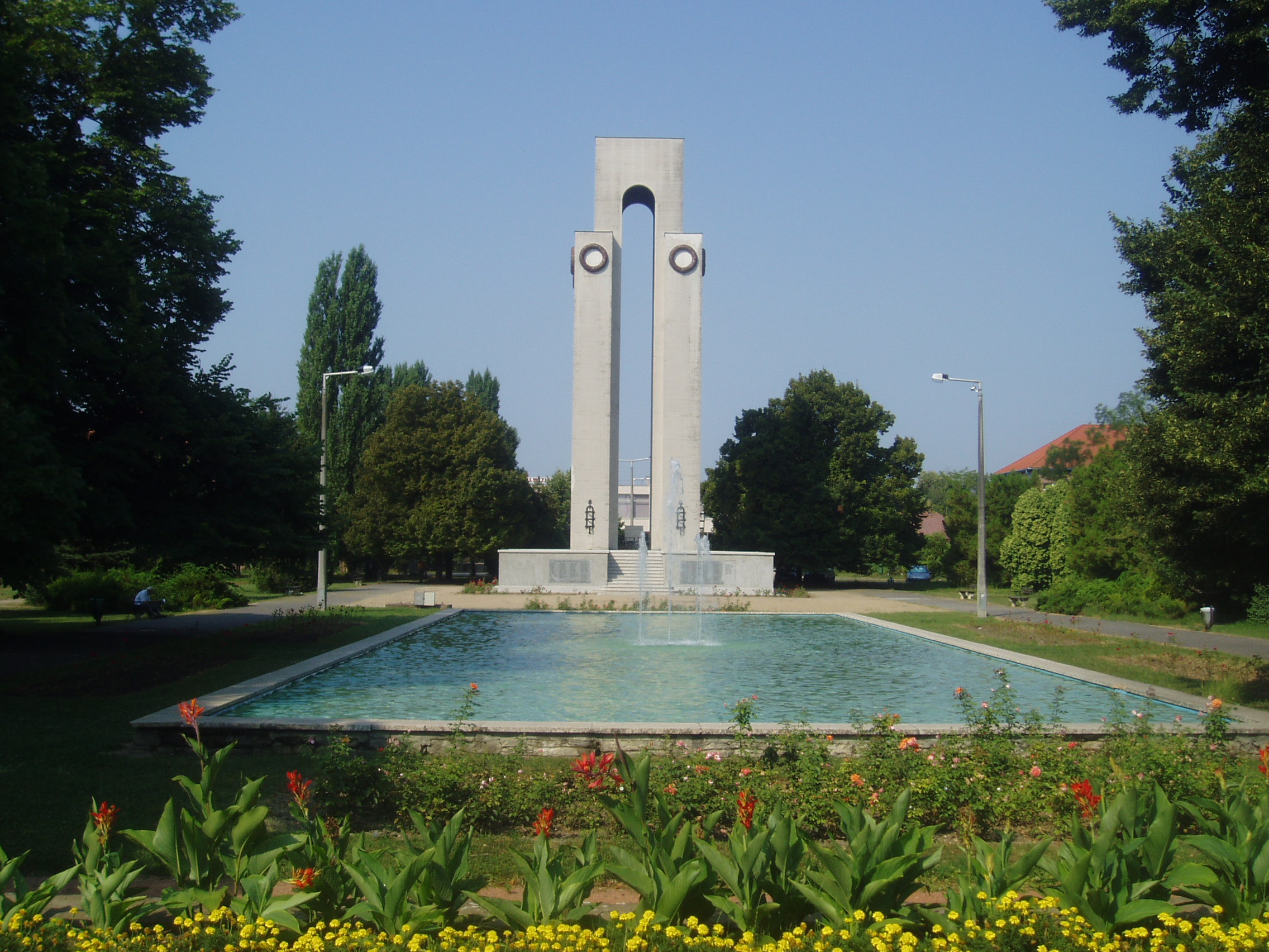 Nyilvános 1820 | 5042 | Mohács, Hősök parkja: Hősök emlékműve | Az egykori vásártérből Árkay Bertalan tervei alapján átalakított Hősök parkjában áll az I. és II. világháború áldozatai előtt tisztelgő hősi emlékmű. Az I. világháborút követően Visy Zoltán pécsi műépítész tervei szerint 1935-ben építették fel a négy oszlopon nyugvó, 24 méter magas emlékművet. Így rótta le kegyeletét a város a harcokban elhunyt 439 mohácsi hős emléke előtt. Erre az emlékműre került a II. világháború áldozatainak és az 1956-os forradalom hőseinek neve is. A fénykép 2006 júliusában készült. Felh. irod.: Látnivalók Pécsett és Baranyában. Miskolc, Well-PRess, 1998 www.mohacs.hu www.vendegvaro.hu |