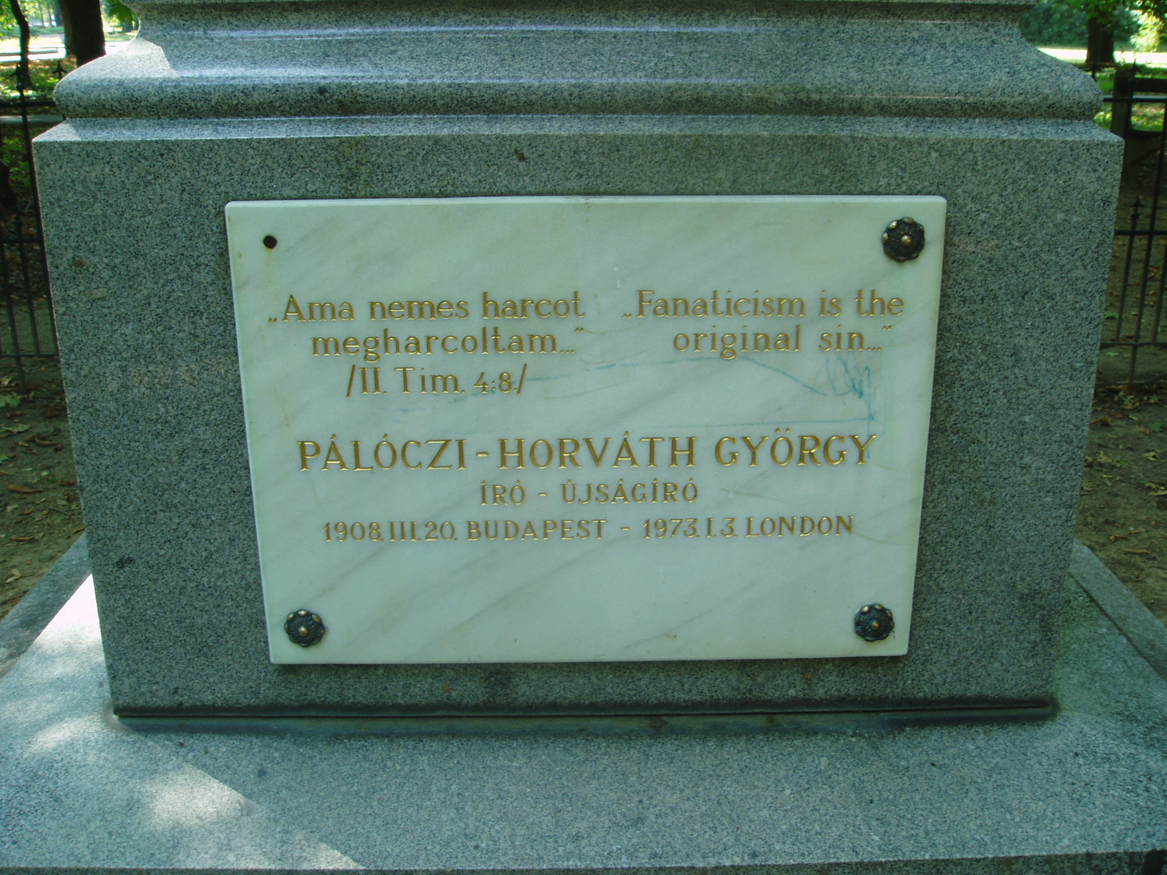 Nyilvános 1160 | 1665 | Sárospatak, Iskolakert: Pálóczi-Horváth-emlékmű | A Református Kollégium (lásd: Sárospatak, Rákóczi u. 1.) bejáratával szemben találjuk az Iskolakertnek nevezett parkot. Az 1980-as években természetvédelmi területté nyilvánított Iskolakert sajátos nemzeti érték, mely egyedülálló az országban. Sétányai mentén Patakhoz kötődő jeles személyiségek szobrai állnak. 1870 körül avatták fel az Iskolakertben a Pálóczi-Horváth-testvérek emlékművét. Készítője báró Vay Miklós főiskolai gondnok, szobrászművész. A rendszerváltás után itt helyezték el Pálóczi-Horváth György (1908-1973) emléktábláját (a család leszármazottja lehetett, de erre nem találtam bizonyítékot - K.K.). Az író, újságíró fordulatos életpályát futott be. Évekig élt az Egyesült Államokban, majd hazatért rövid időre, s a Pesti Napló szerkesztőségében dolgozott. Az 1930-as évek végén ismét elutazott, és Angliában telepedett le, s az angol külügyi szolgálat kötelékébe került. Isztambulban angol összekötőként ő tárgyalt a Kállay-kormány által kiküldöttekkel, akik a kormányfő megbízásából Magyarország háborúból való kiugrását készítették elő. A háború után hazatért Budapestre, s belépett a kommunista pártba. Felelős szerkesztője lett a Tovább című pártlapnak, vezette a Magyar Rádió idegen nyelvű osztályát, majd a Hungária Könyvkiadó irodalmi vezetője lett. Megválasztották a magyar ENSZ-társaság főtitkárává. 1949-ben koholt vádak alapján letartóztatták, öt évet töltött börtönben. 1954-ben rehabilitálták, 1956 végén elhagyta Magyarországot és Londonban telepedett le. Magyar nyelvű írásai főleg a londoni Irodalmi Újságban jelentek meg, amelynek főmunkatársa volt. Visszaemlékezéseit "Elveszett nemzedék" címmel írta meg. Kitűnő műfordító is volt. Londonban hunyt el 1973-ban. A fénykép 2007 augusztusában készült. Felh. irod.: Látnivalók Borsod-Abaúj-Zemplén megyében. Miskolc, Well-PRess, 1995 www.sarospatak.hu/nevezetessegek Magyar életrajzi lexikon Rainer M. János: Esetek a magyar hírszerzés történetéből, 1957-1967. = Rubikon 2002. június-július |