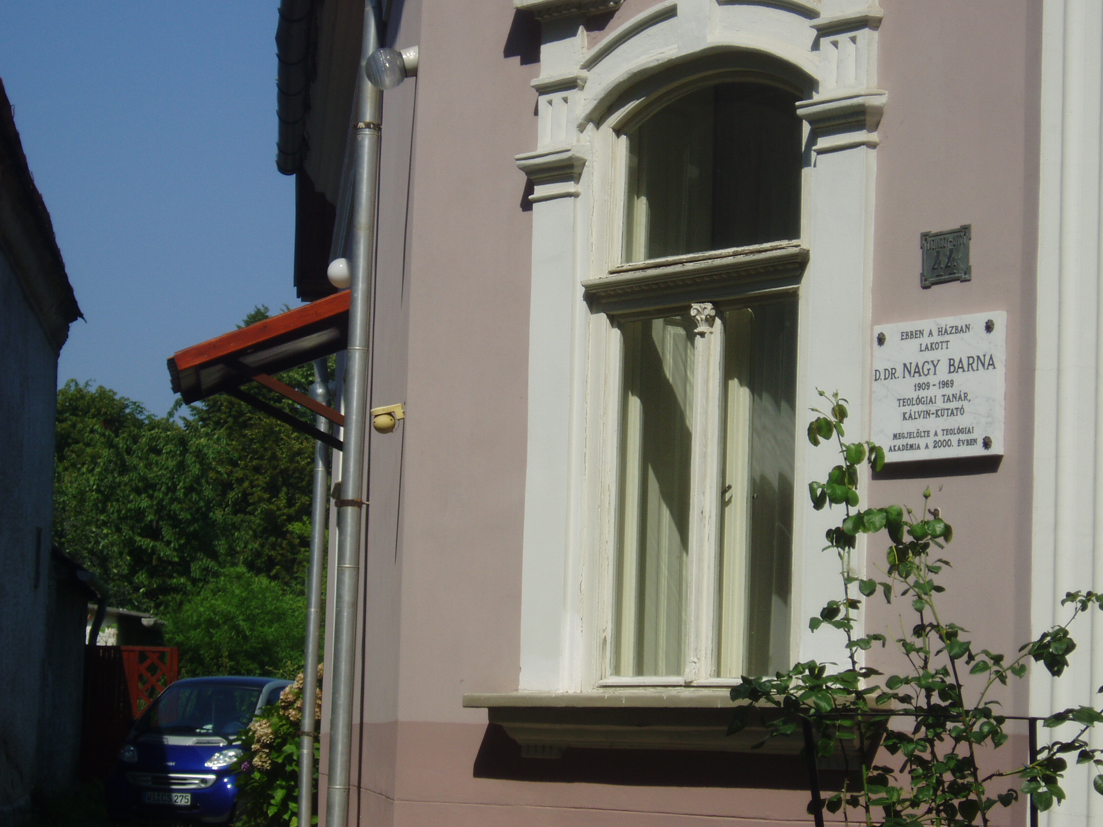 Nyilvános 1017 | 1672 | Sárospatak, Kazinczy utca 44. | Ebben a házban lakott a sárospataki születésű Dr. D. Nagy Barna (1909-1969) teológiai tanár. református teológus, egyháztörténeti író, történész. Külföldi egyetemeken (Montpellier, Zürich, Bonn) végzett tanulmányai, majd néhány év segédlelkészi szolgálat után 1937-ben lett a sárospataki református teológiai főiskola tanára, melynek 1945 után igazgatója, majd rektora volt. A főiskola megszűntével a budapesti Református Teológiai Akadémia rendszeres teológiai tanszékének élére került. Dogmatörténettel, a magyar és közép-európai korai reformáció kérdéseivel foglalkozott. Mai francia nyelvre ültette át és sajtó alá rendezte Kálvin kiadatlan prédikációit; tanulmányokat közölt a Heidelbergi Kátéról, a II. Helvét hitvallásról, Bullingerről, Méliusz Juhász Péterről. Számos előadást tartott a reformáció 450. évfordulóján Bázelben, Genfben, Wittenbergben, majd Zürichben, ahol díszdoktorrá avatták. Régi magyar irodalomtörténettel is foglalkozott. A fénykép 2007 augusztusában készült. Felh. irod.: Magyar életrajzi lexikon |
