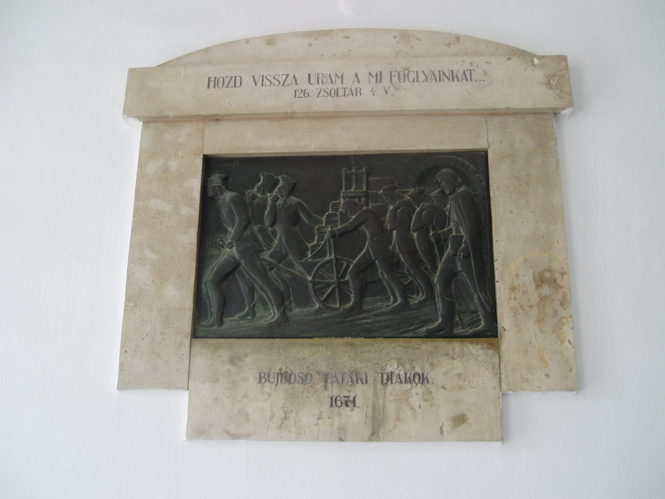 Nyilvános 1130 | 1703 | Sárospatak, Rákóczi utca 1. Református Kollégium | A kollégium főépülete, a Nagy Kollégium a Rákóczi út északi végén található, mely 1804–1814 között korai klasszicista stílusban épült. Szép ráccsal ellátott, háromíves nyílású kapuzat vezet be az un. „nagyportá”-ba, amelyet két sor vaskos pillér három hajóra oszt. Kétoldalt a falakon az iskolatörténet néhány fontosabb eseményének, illetve a kollégium nagy alakjainak bronz domborművű ábrázolásait helyezték el. A képen a bujdosó pataki diákok emléktáblája látható. Az ellenreformáció idején, 1671-ben az iskolát — a jezsuiták késztetésére — erőszakkal megszüntették, tanárait és diákjait menekülésre kényszerítették. A professzorokat és diákokat Gyulafehérváron Apafi Mihály fogadta be. A Thököly–szabadságharc idején került vissza az iskola Patakra, azután újra menekülés következett Göncre, majd Kassára. Az ellenreformáció korának gályarab hitvallói közül huszonkettő pataki diák volt. A Kollégium 1703-tól működhetett ismét Patakon. Az 1938-ben felavatott dombormű alkotója Dabóczy Mihály. A fénykép 2007 augusztusában készült. Felh. irod.: Détsy Mihály: Sárospatak. Bp. Corvina, 1974 Látnivalók Borsod-Abaúj-Zemplén megyében. Miskolc, Well-PRess, 1995 www.sarospatak.hu/nevezetessegek |
