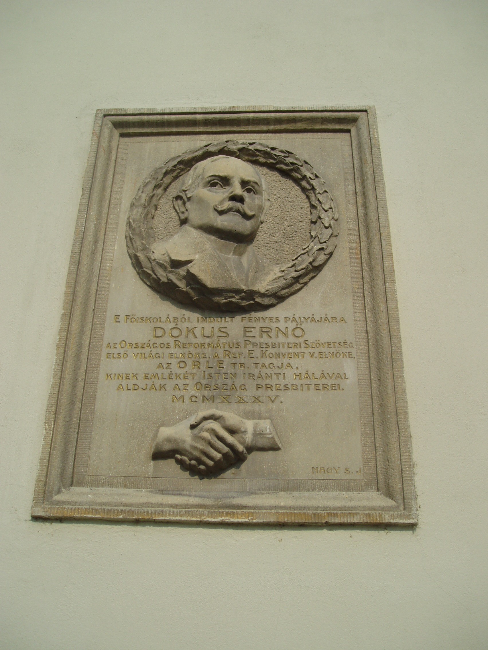 Nyilvános 1174 | 1726 | Sárospatak, Rákóczi utca 1. Református Kollégium | A kollégium főépülete, a Nagy Kollégium a Rákóczi út északi végén található, mely 1804–1814 között korai klasszicista stílusban épült. Szép ráccsal ellátott, háromíves nyílású kapuzat vezet be az un. „nagyportá”-ba, amelyet két sor vaskos pillér három hajóra oszt. Kétoldalt a falakon az iskolatörténet néhány fontosabb eseményének, illetve a kollégium nagy alakjainak domborművű ábrázolásait helyezték el. A képen Dókus Ernő egykori pataki diák, az Országos Református Presbiteri Szövetség első világi elnöke domborműves emléktáblája látható. A fénykép 2007 augusztusában készült. Felh. irod.: Détsy Mihály: Sárospatak. Bp. Corvina, 1974 Látnivalók Borsod-Abaúj-Zemplén megyében. Miskolc, Well-PRess, 1995 www.sarospatak.hu/nevezetessegek |