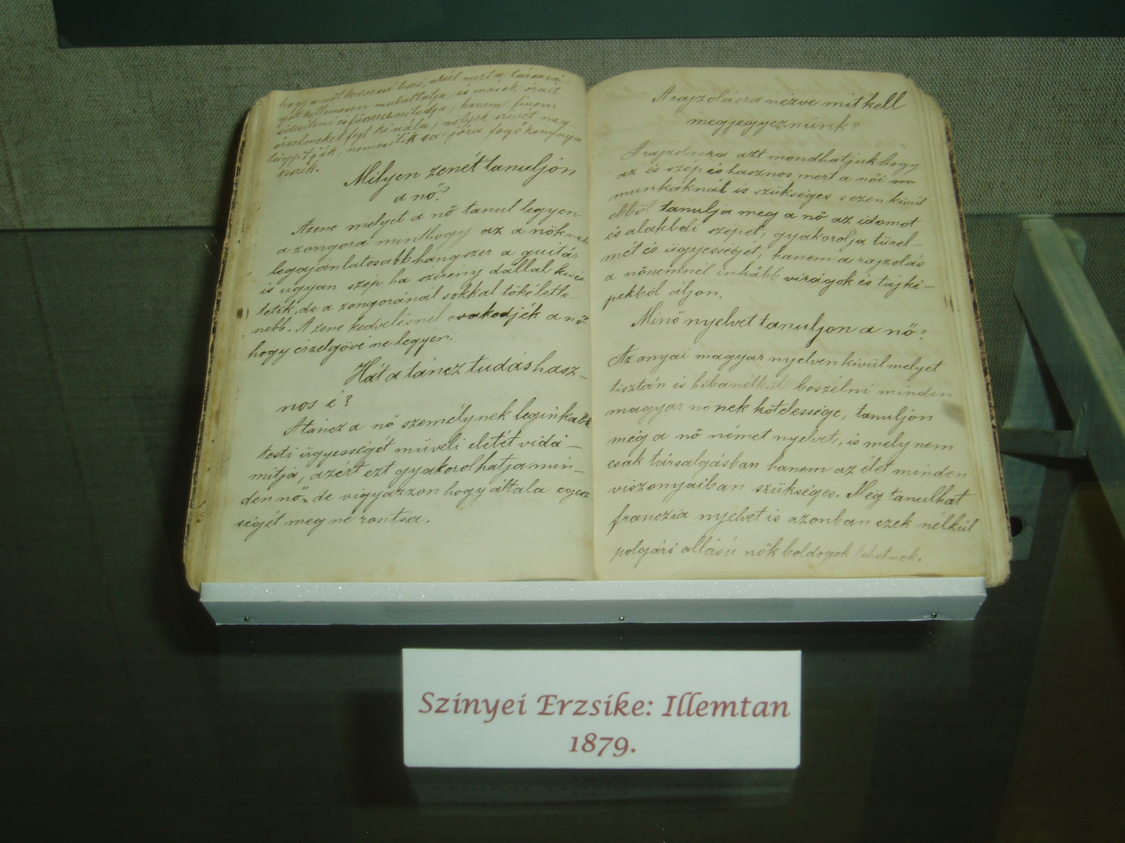 Nyilvános 1130 | 1654 | Sárospatak, Rákóczi utca 1. Református Kollégium | A Kollégium főépületének szárnyai által határolt tágas udvarban áll a régi iskolaépületek utolsó maradványa, az ún. Berna-sor. 1771/72-ben a fizika oktatása számára és a fizikaprofesszor lakásául épült. Az egyemeletes, hosszú szárny déli oldalát később kétszintes, árkádos tornáccal bővítették, feljáróval a nyugati oldalon. Az épület a korabeli provinciális magyar építészet szép példája. Az emelet boltozott termeiben a kollégium történetét bemutató kiállítást rendeztek be. A képen egy XIX. századi fiatal lány, Szinnyei Erzsike 1879-ben kézzel írt illemtankönyve látható. A fénykép 2007 augusztusában készült. Felh. irod.: Détsy Mihály: Sárospatak. Bp. Corvina, 1974 |