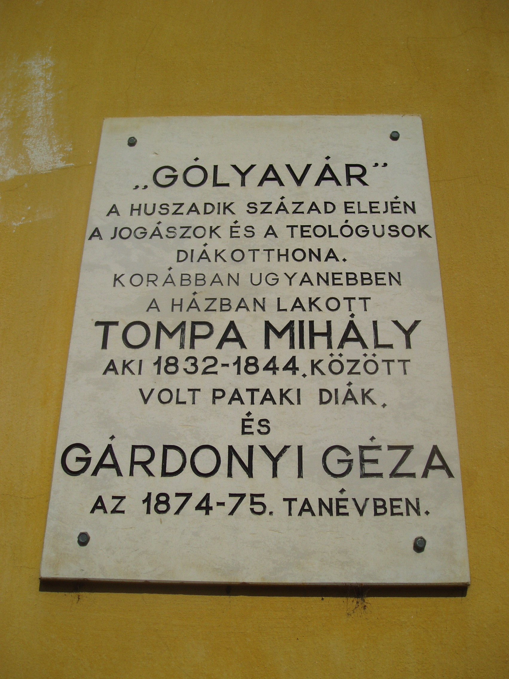 Nyilvános 967 | 1365 | Sárospatak, Rákóczi utca 6. | A barokk stílusú épület hajdan a közeli Református Kollégium (lásd: Sárospatak, Rákóczi u. 1.) ún. kisinternátusa volt. A XX. század elején a benne lakó első éves joghallgatókról és teológusokról a diákok Gólyavárnak nevezték. Korábban ugyanebben a házban lakott Tompa Mihály, aki 1832 és 1844 között, és Gárdonyi Géza, aki az 1874/75-ös tanévben volt pataki diák. A XIX. század második felétől itt működött Trócsányi Bertalan nyomdája és könyvkereskedése, amely jelentős szerepet játszott Sárospatak közművelődésében. A fénykép 2007 augusztusában készült. Felh. irod.: Látnivalók Borsod-Abaúj-Zemplén megyében. Miskolc, Well-PRess, 1995 Erős Zoltán: Magyar irodalmi helynevek A-tól Z-ig. Bp. Kis-Lant Kiadó, 1995 |