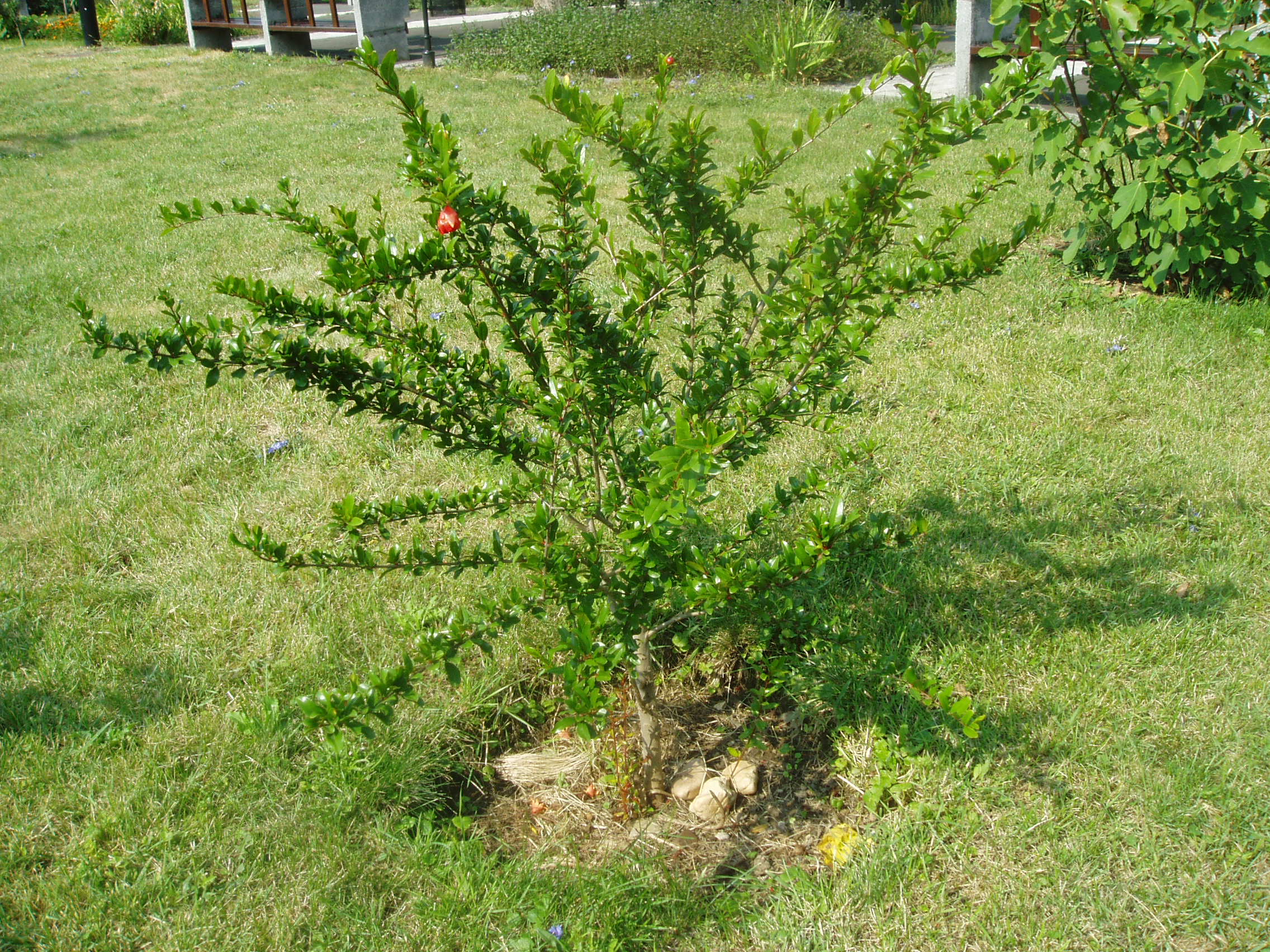 Nyilvános 1006 | 1506 | Sárospatak, Rákóczi utca 1. Református Kollégium | A Kollégium udvarán, a Berna-sor előtt alakították ki a Bibliai kertet. Mintegy ötven féle, a Bibliában említett növény található itt. Az eligazodást alaprajz és a növények jegyzéke segíti. A képen egy kis gránátalmafa látható. A fénykép 2007 augusztusában készült. |