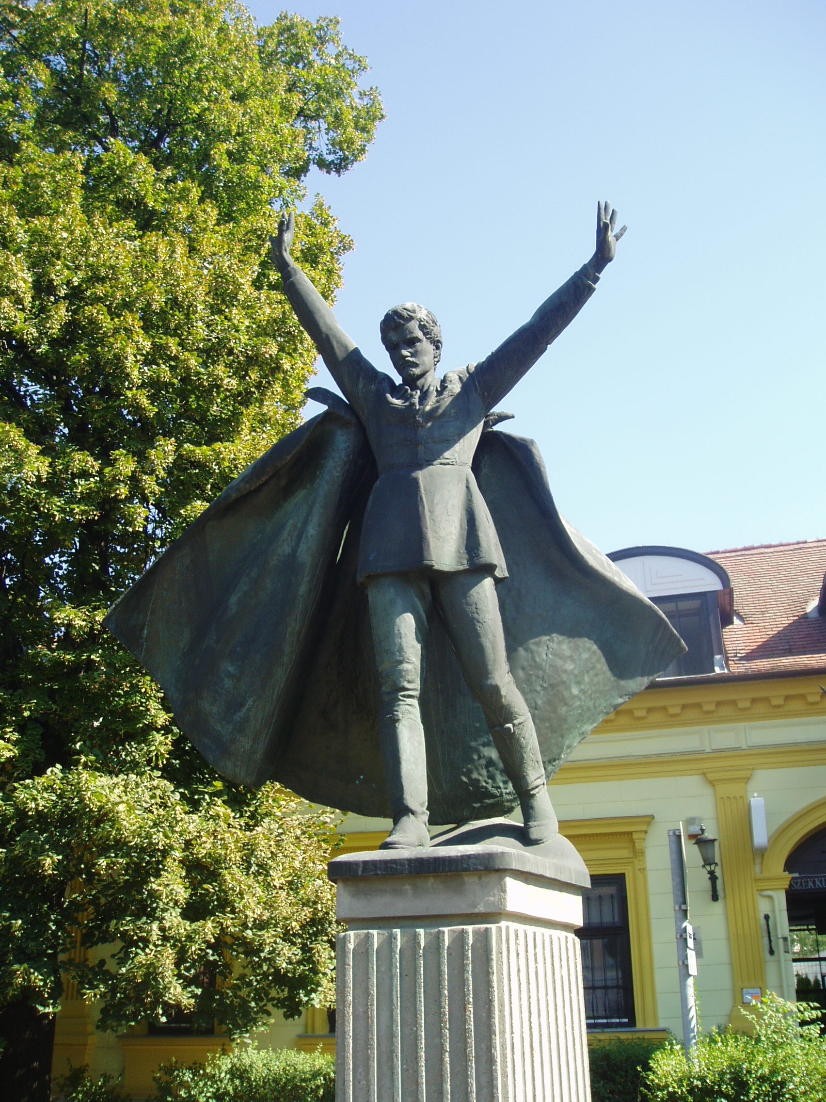 Nyilvános 1632 | 4763 | Hódmezővásárhely, Andrássy utca - Bocskai utca sarok | Petőfi Sándor egészalakos szobra Kamotsay István alkotása (1983). A fénykép 2007 júliusában készült. Felh. irod.: Barangolások Csongrád megyében. Miskolc, Well-PRess, 1997 /Vendégváró/ |