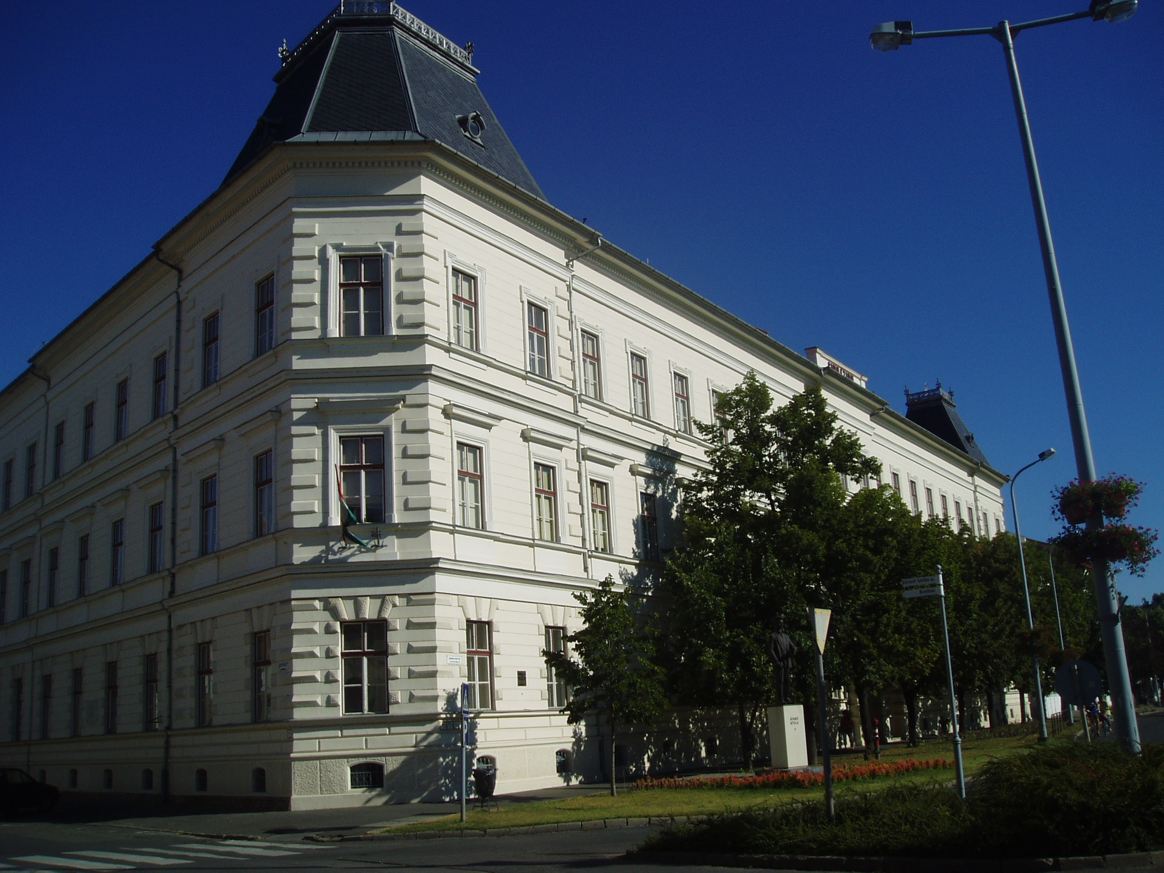 Nyilvános 1053 | 1536 | Makó, Csanád vezér tér 6. József Attila Gimnázium | A város központjából északra nyílik a sugárútszerű Csanád vezér tér. Nyugati oldalán áll a József Attila Gimnázium 1895-ben, eklektikus stílusban, Gerle Lajos tervei alapján emelt épülete. Itt tanított négy évig Juhász Gyula, itt tanult József Attila, majd Erdei Ferenc. A tizenöt és fél éves József Attila 1920 októberében érkezett Makóra. Verseire Juhász Gyula figyelt fel, akinek pártfogása révén a nyugat is közölt néhányat belőlük. Makói diák volt, amikor tizenhét éves korában Szegeden megjelent első verseskötete, a "Szépség koldusa", Juhász Gyula prófétikus előszavával: "A legnagyobb készséggel és örömmel vállalkoztam arra, hogy József Attila első verses könyvéhez előszót írjak. Ez a nagyon fiatal és nagyon tehetséges költő a legteljesebb mértékben megérdemli, hogy a figyelem feléje forduljon, hogy igaz szeretettel és reménységgel fogadja a magyar olvasóközönség és hogy a kritika se menjen el mellette közömbösen vagy ellenségesen és ne elégedjék meg vele szemben a nyomtatásban megjelenőknek rendesen kijáró vállveregetéssel. József Attila Isten kegyelméből való költő." Az épület előtt áll 2005-ben, születése centenáriumán újjáavatott szobra, a járdába ágyazottan pedig első verseskötetének bronzba öntött címlapja idézi emlékét. Egykor a gimnázium közvetlen közelében állott a Hollósy Kornélia Színház épülete. A színház lépcsőjén készült 1924. szeptember 18-án az a híres csoportkép, amelyen Juhász Gyula, Móra Ferenc és mások társaságában ott van József Attila is. Aznap a színházban három szegedi író, Juhász Gyula, Móra Ferenc és Réti Ödön egy-egy egyfelvonásosát mutatták be. A fénykép 2007 júliusában készült. Felh. irod.: Barangolások Csongrád megyében. Miskolc, Well-PRess, 1997 Nem én kiáltok. József Attila Szegeden. = www.sk-szeged.hu/kiallitas/jozsefattila |