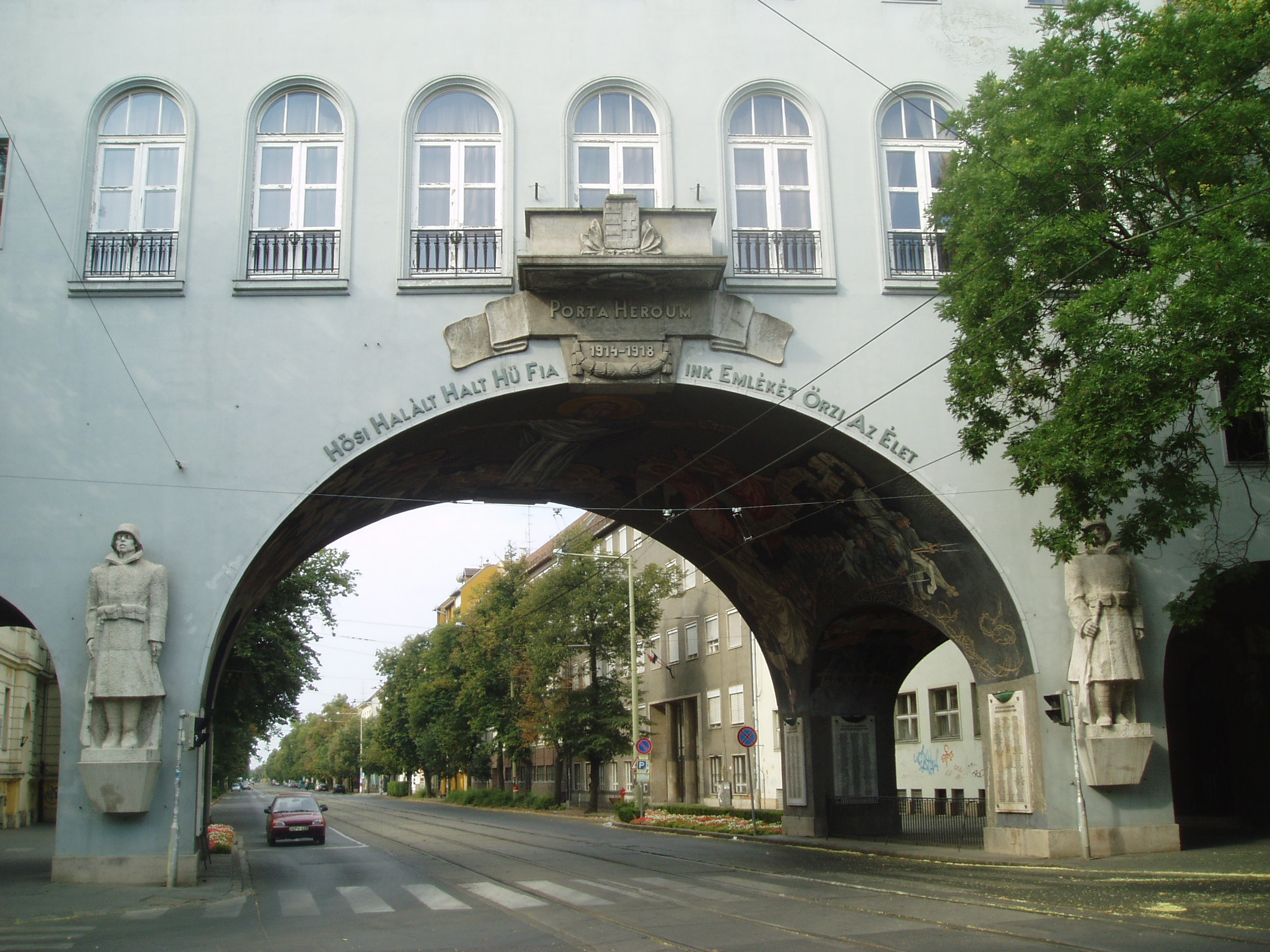 Nyilvános 1058 | 3354 | Szeged, Aradi vértanúk tere: Hősök kapuja | Az Aradi vértanúk tere déli oldalát a nagyszabású Hősök kapuja (Porta heroum) határolja. Az 1936-ban Pogány Móric tervei szerint épült kapu épült kapu honvédszobrai - az élő és a halott katona - Lőte Éva 1937-ben készült alkotásai, s az I. világháború áldozataira emlékeztetnek. A boltív freskóit Aba-Novák Vilmos készítette. A festményeket 1949-ben levakolták, csak a Millenniumra sikerült feltárni és helyreállítani őket. A művész a képsorozaton három témát jelenített meg: a háborús emlékezést, a hősi halottak dicsőítését és Horthy Miklós elindulását Szegedről. Középen, fejjel a tér felé Aba-Novák az ítélkező Krisztus mintegy 8 méteres alakját ábrázolta, lábainál a harsonás, ítélkező angyalok csoportjával. A kapu alatt kezdődik a nagyállomásra vezető Boldogasszony sugárút. A fénykép 2007 júliusában készült. Felh. irod.: www.vendegvaro.hu |