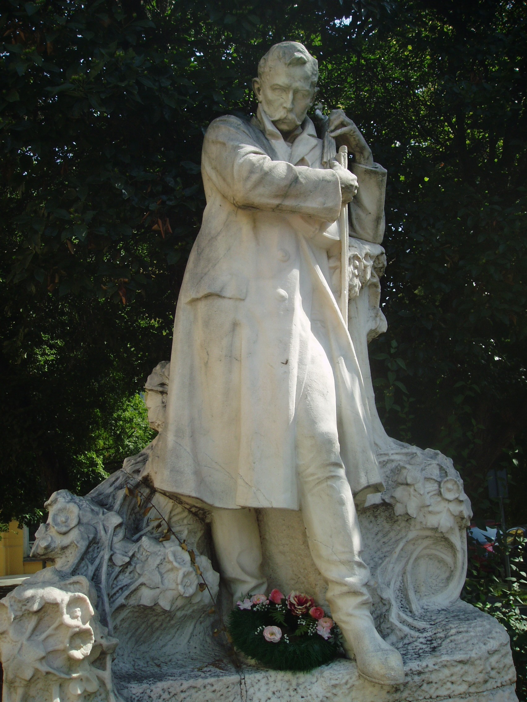 Nyilvános 999 | 1499 | Szeged, Arany János utca 2. Dankó Pista szobra | Az egykori Kass/Hungária szálló előtt áll Dankó Pista lírai szépségű, romantikus szobra, Margó Ede 1912-ben felavatott alkotása (eredetileg a a Stefánián állították fel, a Tisza-parthoz közeli részen, a színház bejáratának tengelyében). A monolit jellegű, egy darabból faragott szobor markáns festői hatásokkal fejezi ki a dalköltő lelkének mélységeit. A hegedűjét pengető, elmélázó nótaköltő mögé a szobrász nyíló vadrózsabokrot mintázott, vésője nyomán csipkefinom részletek és nagy felületekben lágyan elomló formák teremtik meg a szobor mélabús hangulatát. A nevezetes szobor történetéhez hozzátartozik az a tréfás szegedi anekdota, amely szerint a dalköltő mindannyiszor megpengeti hegedűjét, valahányszor szűz lány megy el előtte… A fénykép 2007 júliusában készült. Felh. irod.: Péter László: Szeged. Bp. Panoráma, 1981 Tóth Attila: Szeged szobrai és muráliái. Szeged, 1993 |