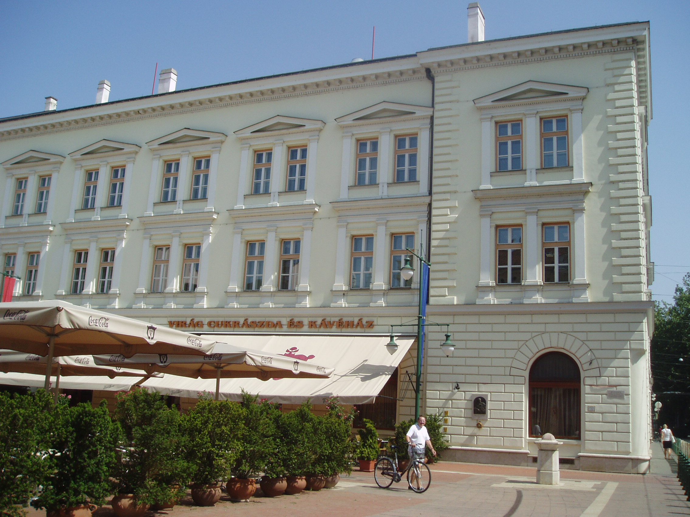 Nyilvános 1204 | 1617 | Szeged, Klauzál tér 1. Az új Zsótér-ház | A Klauzál tér, amelyet egységet sugalló egy- és kétemeletes, városképi szempontból is jelentős épületek határolnak, hajdan a Széchenyi térből vált ki. Bár négy felől is utcák bontják meg, mégis zárt hatást kelt. A Széchenyi és a Klauzál teret kettéosztó eklektikus stílusú műemlék épületet Zsótér Andor építtette 1873-ban szállodának. Földszintjén van a Virág cukrászda, a turisták és városlakók egyik kedvenc helye. Előde, Allemann János és Hózig Péter cukrászdája a városi palota felépülése után hamarosan ideköltözött. Az üzlet 1884-ben Árvay Sándor és fia tulajdonába került. A "szegedi Gerbeaud"-nak nevezett cukrászda hírnevét 1922-től a Virágh-testvérek öregbítették. Virágh Béla jóvoltából olykor ingyen reggelihez jutott itt az egyetemista József Attila. Az építtető Zsótér Andor (1824-1906) jeles és gazdag kereskedőcsalád sarja volt (részletesebben lásd: Szeged, Széchenyi tér 9.). Vezető szerepet játszott a reformmozgalomban, s a szabadságharcban honvéd főhadnagyként harcolt. Szeged ismert közéleti személyisége mecénása volt íróknak, művészeknek, segítője a rászorultaknak. Pártfogolta például Vastagh György szobrászt és Dankó Pistát. A Nagy Árvíz idején közel háromezer embernek adott menedéket házában, segítette Szeged város újjáépítését. Domborműves emléktábláját Tóbiás Klára készítette. A nagy árvíz előtt az épületben a pénzügyigazgatóság és az adóhivatal működött, 1879 és 1883 között pedig itt tevékenykedett a várost újjáépítését irányító, Tisza Lajos vezetésével működött királyi biztosság. A fénykép 2007 júliusában készült. Felh. irod.: Péter László: Szeged. Bp. Panoráma, 1981 Zsótér Andor dombormű kihelyezése. = www.szegedvaros.hu |