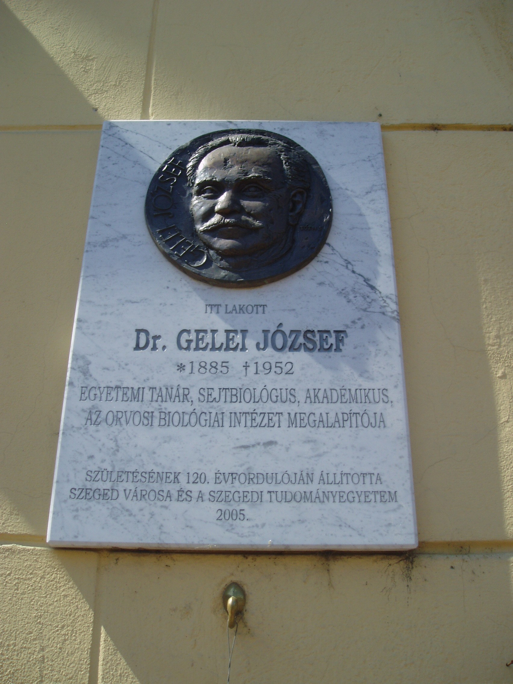 Nyilvános 979 | 1425 | Szeged, Tisza Lajos körút 37. | Az épületen 2005-ben elhelyezett portrédomborműves emléktábla tanúsága szerint itt lakott Dr. Gelei József (1885-1952) egyetemi tanár, sejtbiológus, akadémikus. A kolozsvári egyetemrő került az intézmény áttelepülésével Szegedre 1924-ben, ahol az állattani és összehasonlító bonctan tanára lett. Volt a természettudományi kar dékánja és az egyetem rektora. 1940-ben, Kolozsvár visszacsatolásakor az egyetemmel együtt visszatért Kolozsvárra, amelyet 1944 őszén újra el kellett hagynia. 1945-től a szegedi egyetem orvosi karán a biológia tanára, a biológiai intézet vezetője volt. A véglénykutatás, a citológia és a gerinctelenek mikrotechnikája területén nemzetközi szaktekintélynek számított. Nevéről számos újonnan felfedezett élőlényt neveztek el. A fénykép 2007 júliusában készült. Felh. irod.: www.bibl.u-szeged.hu/bibl/exhib/evfordulo/gelei/gelei.html |