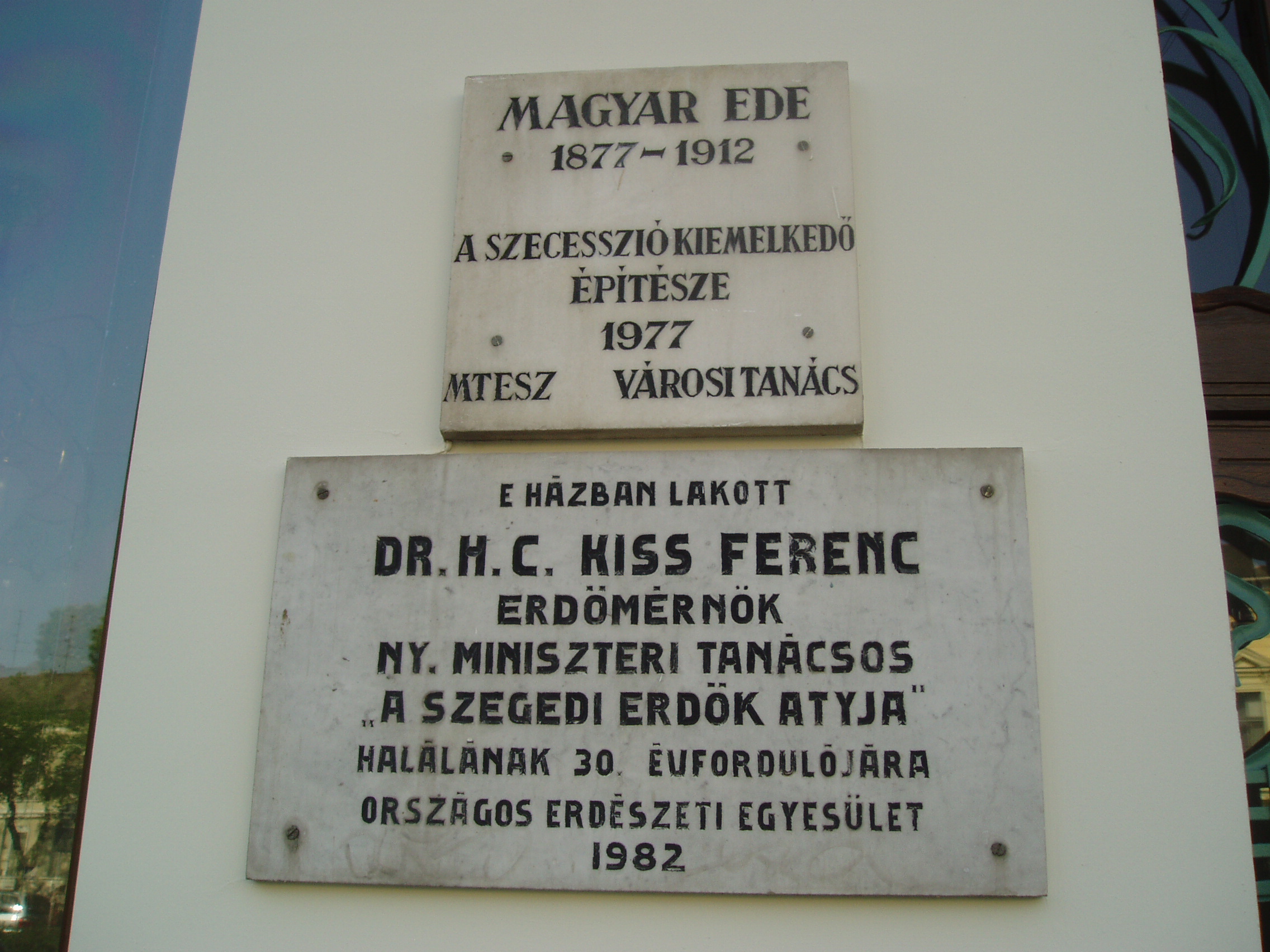 Nyilvános 1048 | 1430 | Szeged, Tisza Lajos körút 56. Reök-palota | A Reök-palota 1907-ben épült szecessziós stílusban Magyar Ede (1878-1912) tervei szerint. Az annakidején lakóházként funkcionáló épület lakója volt Kiss Ferenc főerdőtanácsos. 1860-ban született a Sopron megyei Szilsárkányban, egyszerű parasztszülők nyolcadik gyermekeként. A selmecbányai Erdészeti Akadémián szerzett erdőmérnöki oklevelet, majd 1885-ben erdőtisztként Szegedre került, hogy felügyelje a város körüli, állami kezelésbe adott erdőket. Szívügye volt az Alföld homokterületeinek betelepítése, nem véletlenül nevezték "a szegedi erdők atyjának". A palotán Magyar Ede építész emléktábláját is elhelyezték. A fénykép 2007 júliusában készült. Felh. irod.: Péter László: Szeged. Bp. Panoráma, 1981 www.puszta.com/hun/programs/cikk/reok_palota_ujjaszuletese |