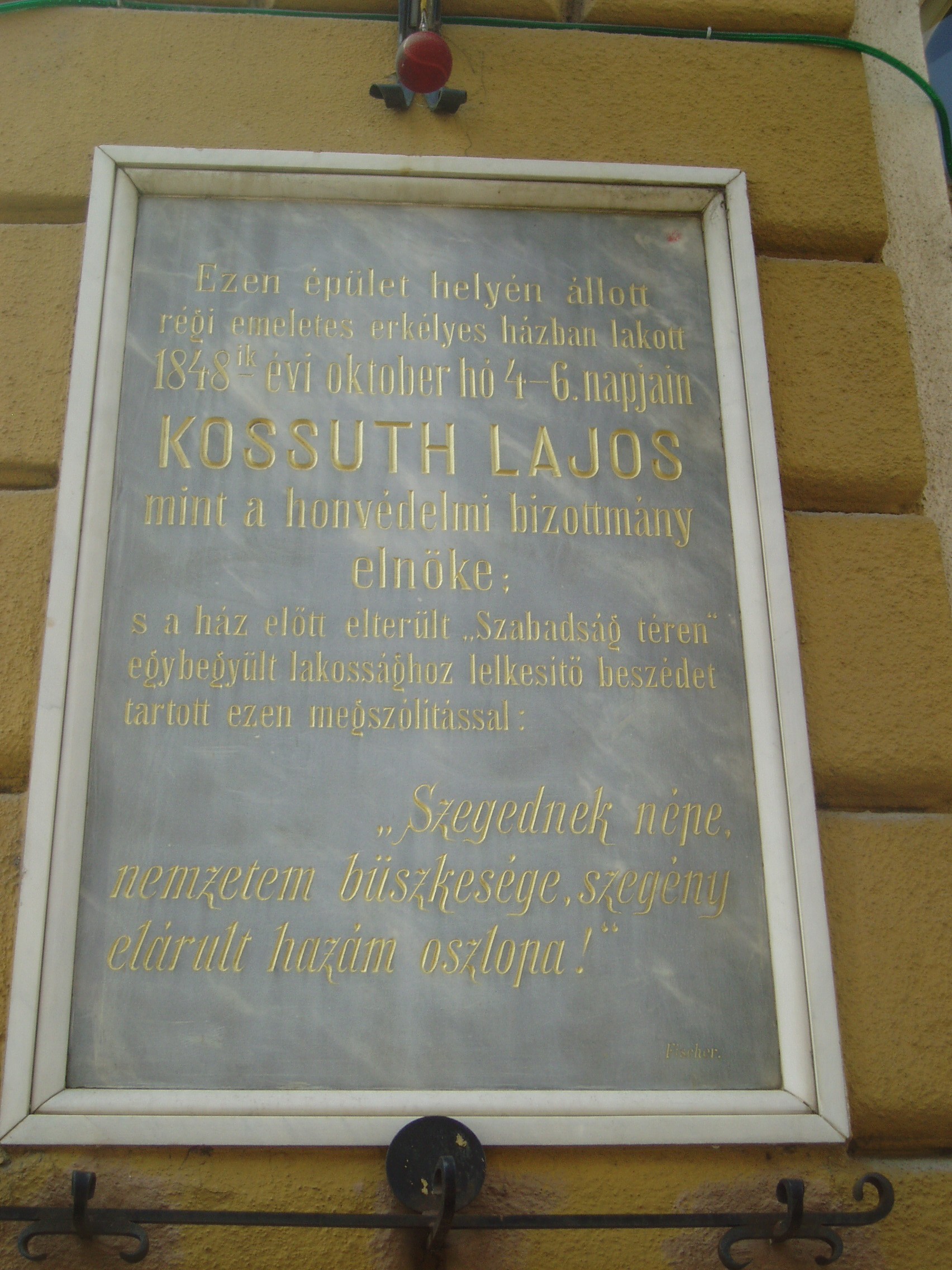 Nyilvános 1058 | 1548 | Szeged, Victor Hugo utca 6. | A mai épület helyén egykor az ún. Baurnfeind-ház állott. Itt szállt meg 1848. október 4. és 6. között Kossuth Lajos, a Honvédelmi Bizottmány elnöke. Ez elé az épület elé hozták október 4-én a Dömötör-templom szószékét, s innen mondta el Kossuth Lajos a Szabadság téren összegyűlt tömeg előtt emlékezetes toborzó beszédét: "Szegednek népe, nemzetem büszkesége, szegény elárult hazám oszlopa!" A fénykép 2007 júliusában készült. Felh. irod.: Péter László: Szeged. Bp. Panoráma, 1981 |