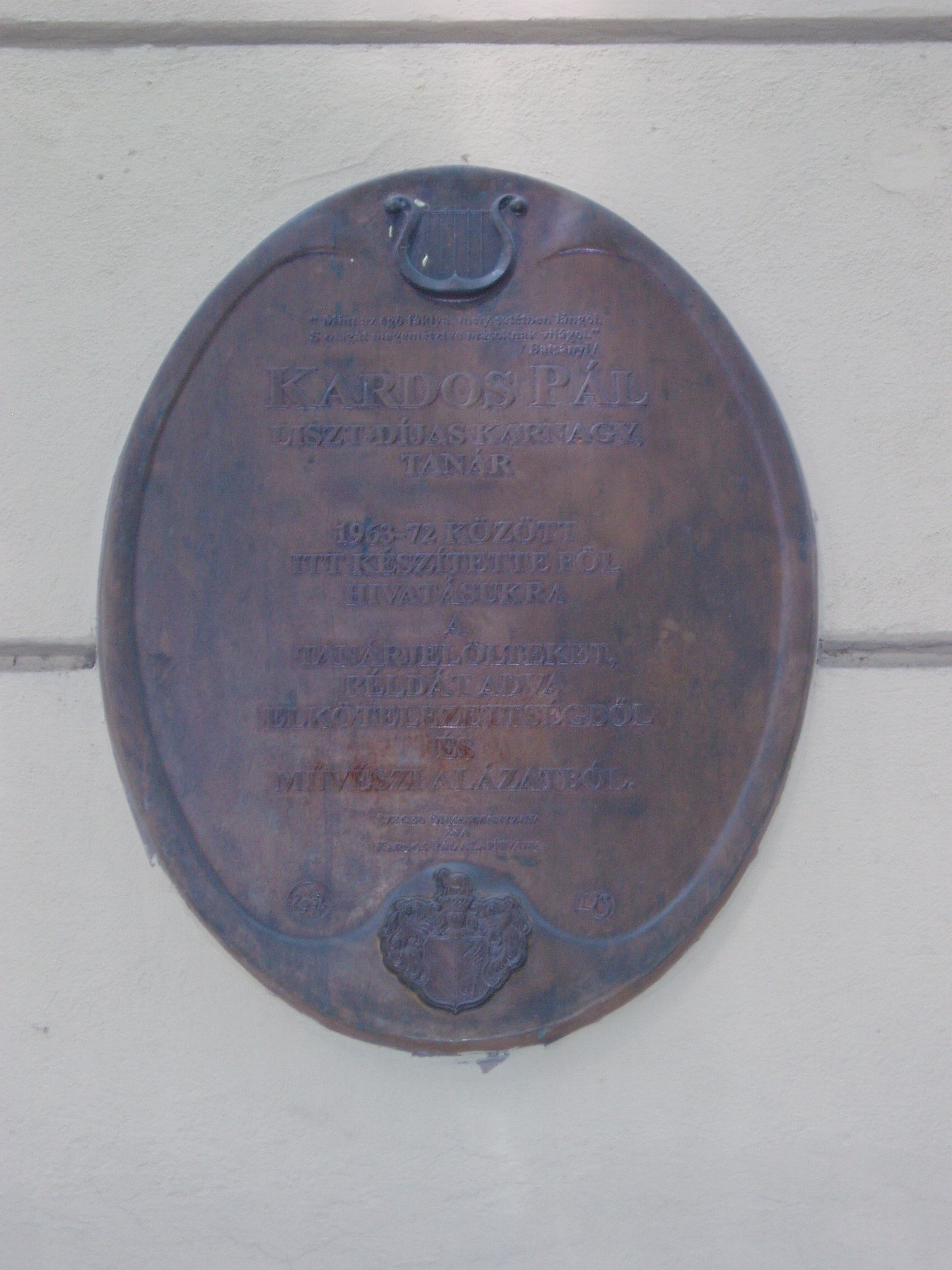 Nyilvános 1046 | 1673 | Szeged, Szentháromság utca 70-76. | Az egyházi Karolina Iskola épületében az elmúlt rendszer idején a Juhász Gyula Tanárképző Főiskola Ének–zene Tanszéke működött. Itt tanított Kardos Pál Liszt–díjas karnagy, aki 1961–1972 között a főiskola leánykarát is vezette. Kardos Pál tanári személyisége, művészi igényessége meghatározóvá vált növendékei és kollégái körében. Emléktábláját 2002. március 22-én avatták fel az épület falán. Az épületen portrédomborműves emléktábla idézi Bálint Sándor néprajztudós (1904–1980), „a legszögedibb szögedi” alakját, aki 1937 és 1941 között az itt működő Iskolanővérek tanítóképzőjének tanára volt. A fénykép 2007 júliusában készült. Felh. irod.: Tizenkét év kőben és ércben. Szeged, Önkormányzat, 2002 |