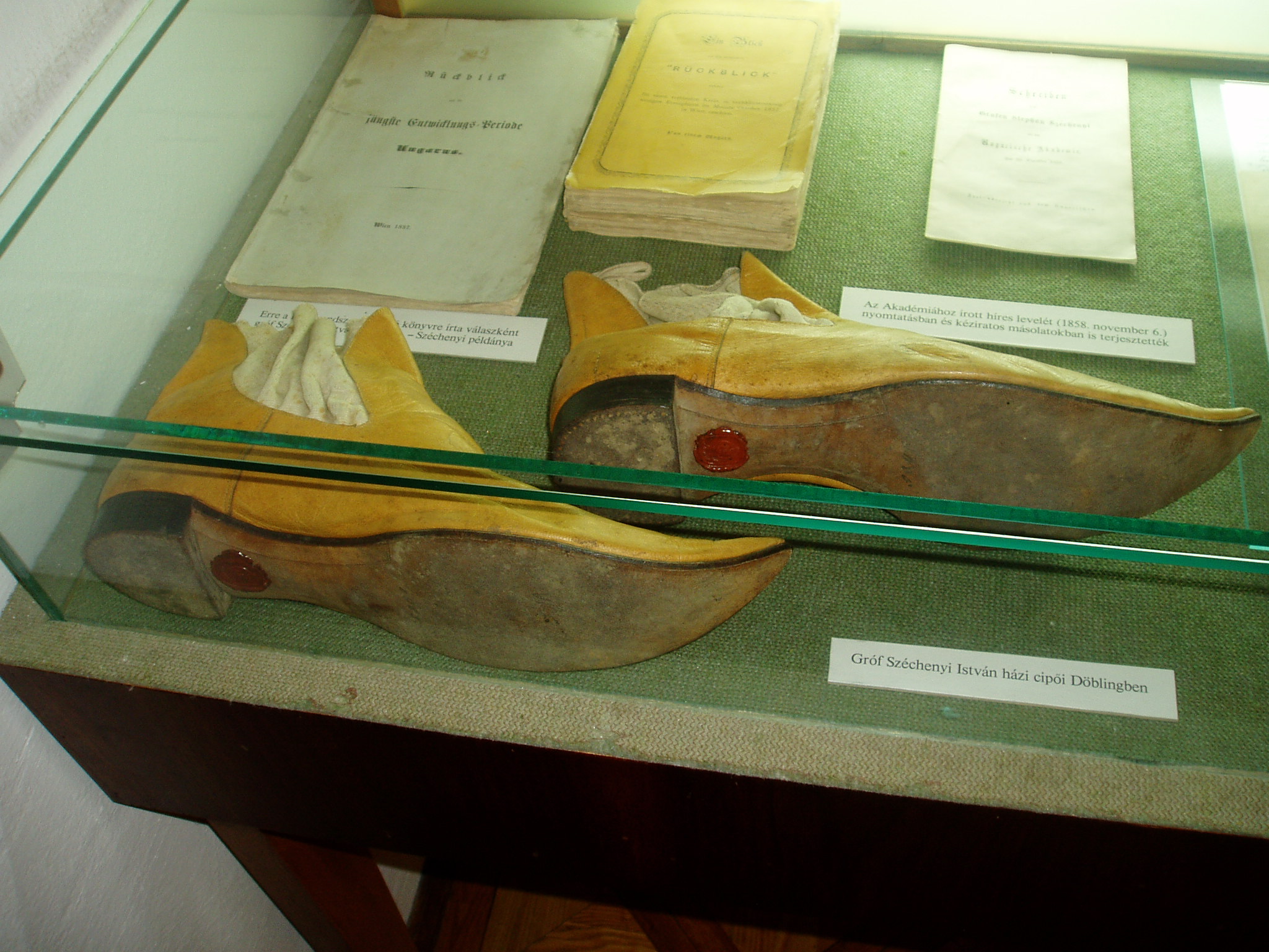 Nyilvános 1313 | 2195 | Nagycenk, Széchenyi-kastély | A barokk kastély építészeti szempontból is érdekes. Kiemelt jelentőségét azonban az adja, hogy itt élt a "legnagyobb magyarként" tisztelt Széchenyi István. A kastély ma emlékmúzeum. Az előcsarnok márvány mozaikpadlója és kandallója a kastély eredeti értékei közé tartozik. Az alsó szinten az életutat követhetjük nyomon. Az egybenyíló termek sorában elhelyezett tárgyak közül több közvetlenül Széchenyi Istvánhoz kötődik, így dolgozószobájának bútorai és íróasztala. A képen látható virtinben helyezték el Széchenyi István Döblingben használt házicipőjét más relikviák társaságában. A fénykép 2005 júliusában készült. Felh. irod.: Látnivalók Győr-Moson-Sopron megyében. Miskolc, Well-PRess, 2000 |