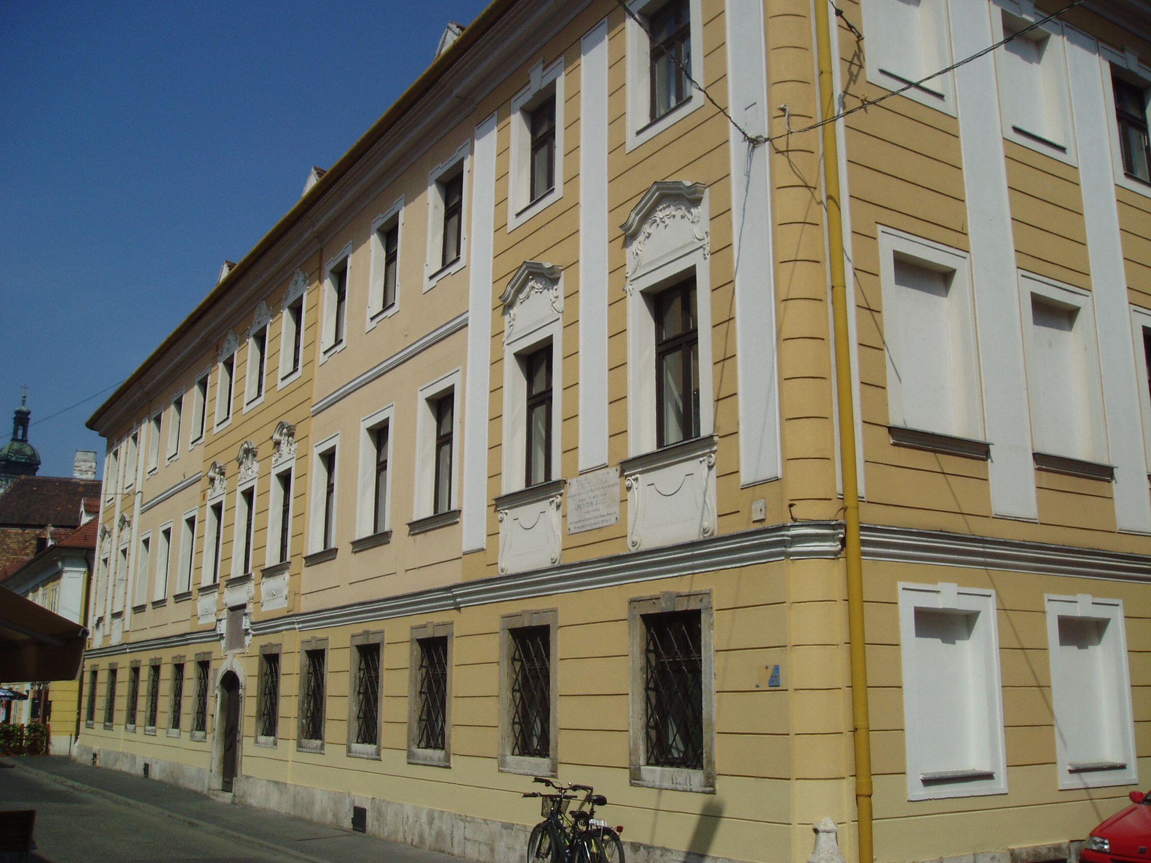 Nyilvános 1119 | 1771 | Győr, Apáca utca 5. Káptalani zenészek háza | A XVI. század első felében ezen a telken a városháza állott. Abban rendezték be a a székeskáptalan által fenntartott XVI–XVII. századi „magyar iskolát”, amelyet káptalandombi otthonából a német katonaság üldözött el. Az ekkor már kétemeletes épület az iskola mellett a székesegyházi (lásd: Győr, Káptalandomb: Székesegyház) muzsikusoknak is otthona lett, mint a Káptalani zenészek háza. Lakott benne Istvánffy Benedek, aki 1778 előtt működött a székesegyház zenei vezetőjeként, majd 1832 és 1854 között itt lakott Richter Antal. Felesége nagyszerű énekesnő volt. 1843. április 4-én ebben a házban született fiuk, Richter János (Hans Richter), a későbbi legendás Wagner–karmester. A felvétel 2008 május végén készült. Felh. irod.: Cziglényi László: Győr. Bp. Panoráma, 1981 Orbánné Horváth Márta: Emlékművek, emléktáblák győri kislexikona. Győr, Városi Könyvtár, 2001 Vavrinecz Veronika: Richter Antal (1802–1854) élete és működése. 2003, Szkarabeusz Kiadó |