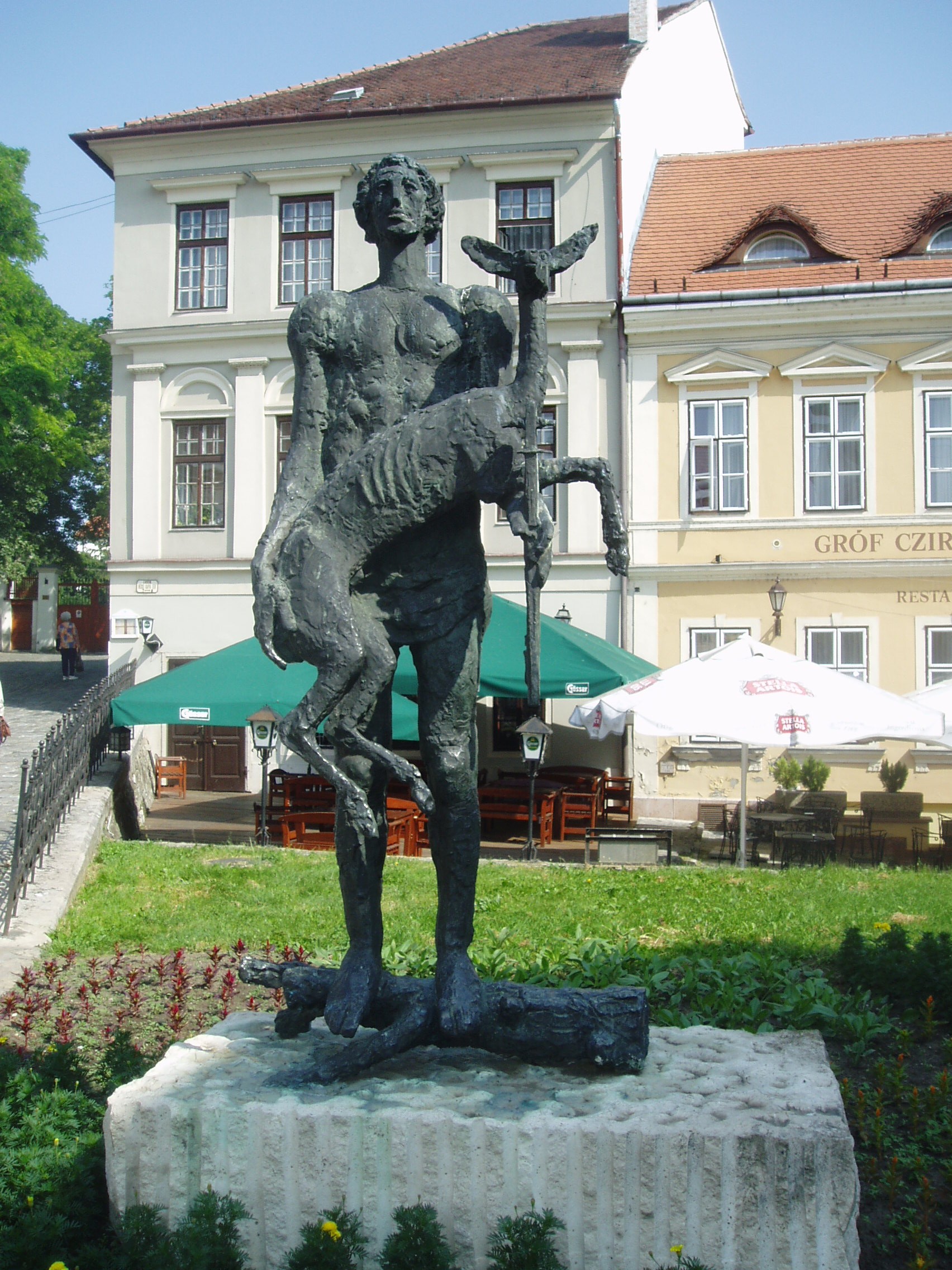 Nyilvános 1267 | 2128 | Győr, Bécsi kapu tér 6. előtt | Somogyi József: Nimród című szobrát 1983-ban állították fel. Címe akkor Vadmentés volt, s az 1954-es árvíz utáni ásványrárói vadmentés emlékére készítette (a művész Ásványrárón töltötte gyermekkorát). A felvétel 2008 május végén készült. Felh. irod.: http://nofre-retro.blogspot.com/2010/03/somogyi-jozsef-szobrasz-vadmentes-cimu.html |