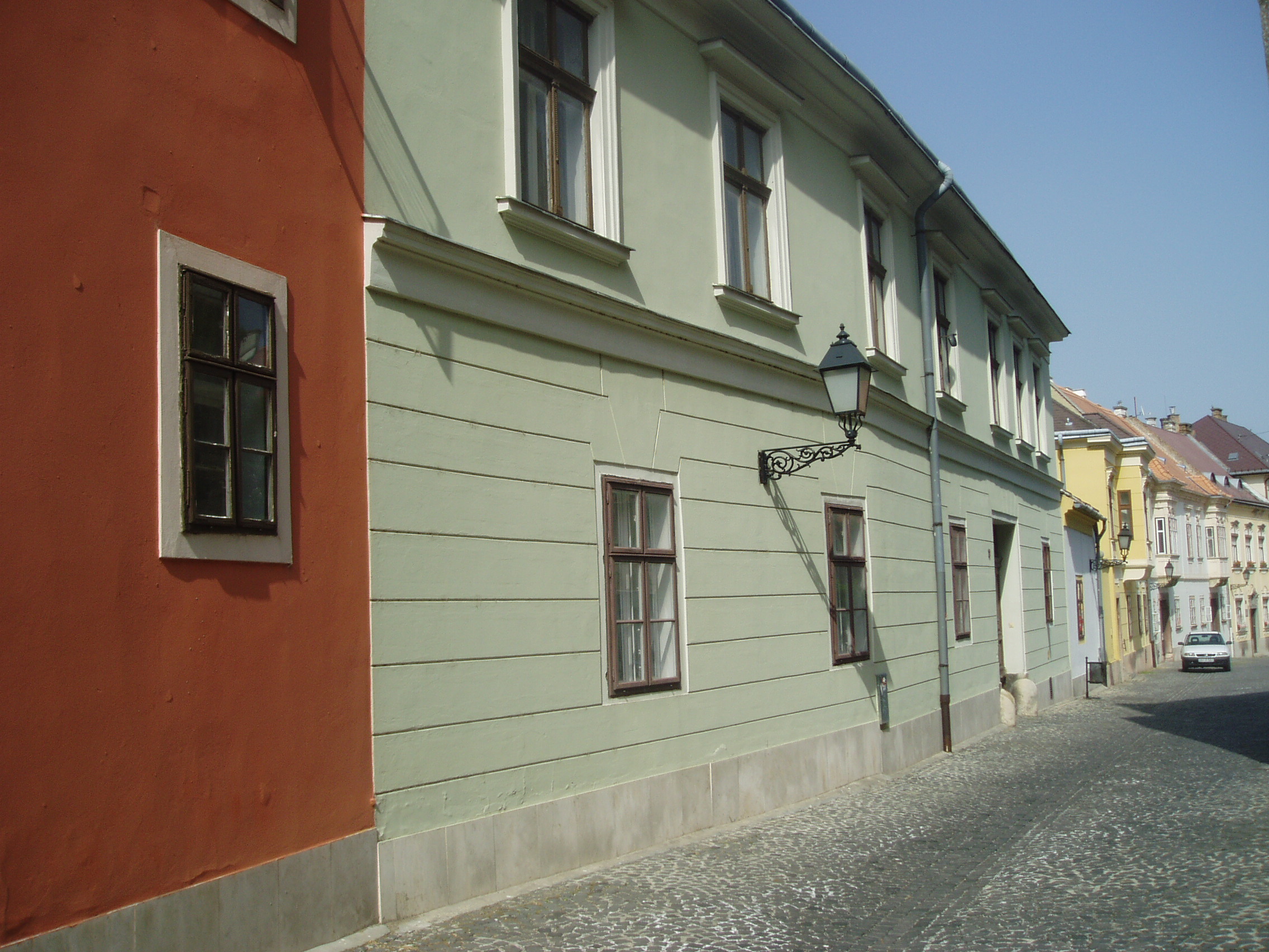 Nyilvános 1014 | 1926 | Győr, Káptalandomb 11. | A székesegyház apszisától kelet felé sétálva, a dombtetőről levezető út mentén találjuk a Káptalandomb legértékesebb műemlékházait. A 11. számú egyemeletes, klasszicista stílusú épület, mai homlokzata az 1800-as évek elején készült. A felvétel 2008 május végén készült. Felh. irod.: Cziglényi László: Győr. Bp. Panoráma, 1981 |