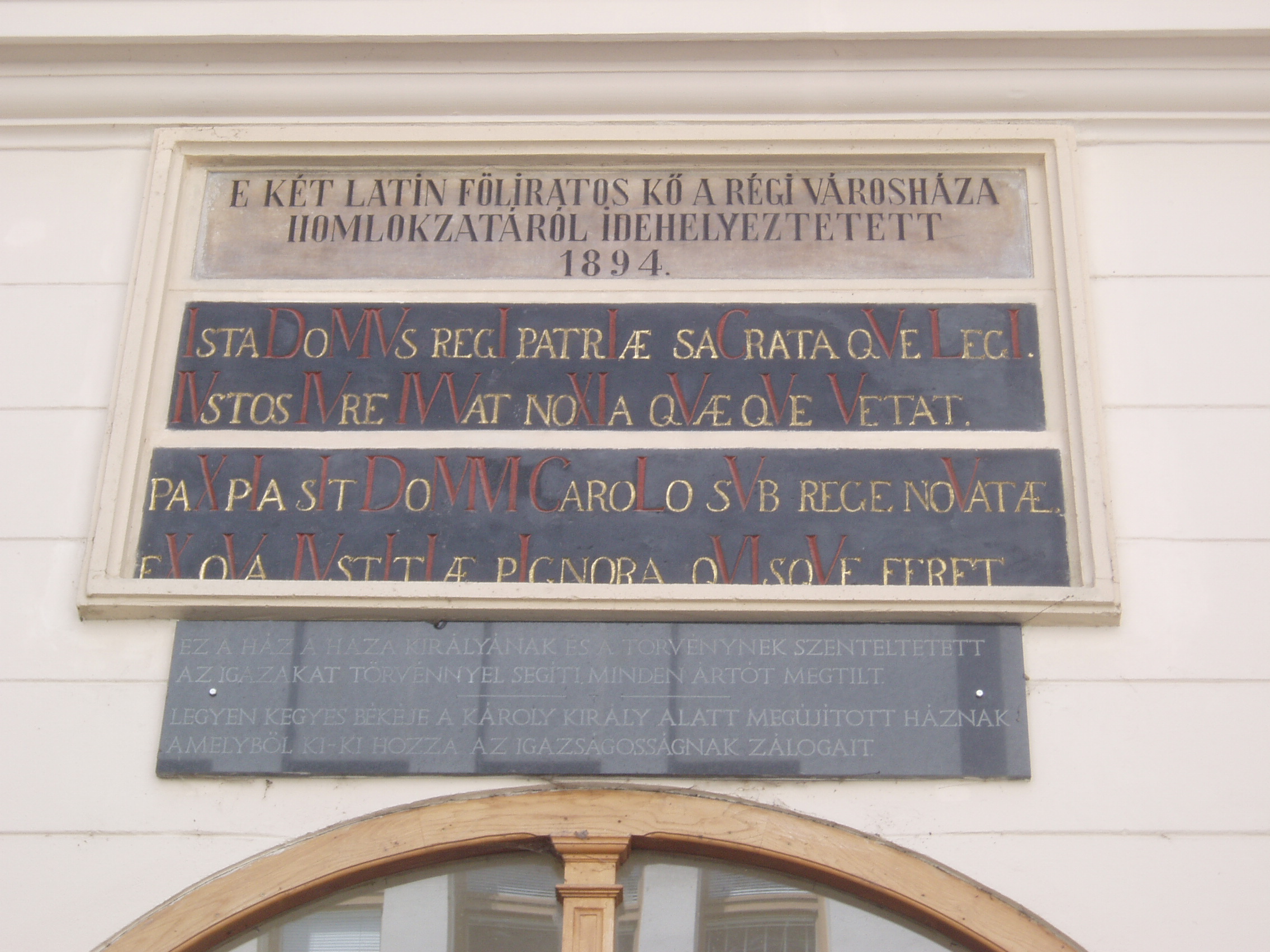 Nyilvános 992 | 1433 | Sopron, Fő tér 1. Városháza | 1497-től állt ezen a helyen Sopron első számú középülete. Ekkor vásárolta meg és alakíttatta át a város az akkori régi házat. Itt működött a sokoldalú Lackner Kristóf polgármester, aki jeles művészként az épületet kívül és belül festményekkel, feliratokkal díszítette. A mai, eklektikus stílusú városháza az 1890-es évek első felében épült a régi, rossz állapotú középület helyére. Tervezői Hintraeger Mór és fia voltak. A régi városházából két, latin nyelvű feliratot beépítettek az új épületbe. A kép 2008 júniusában készült. Felh. irod.: Czellár Katalin: Sopron. 3. jav. kiad. Bp. Panoráma, 2000 |