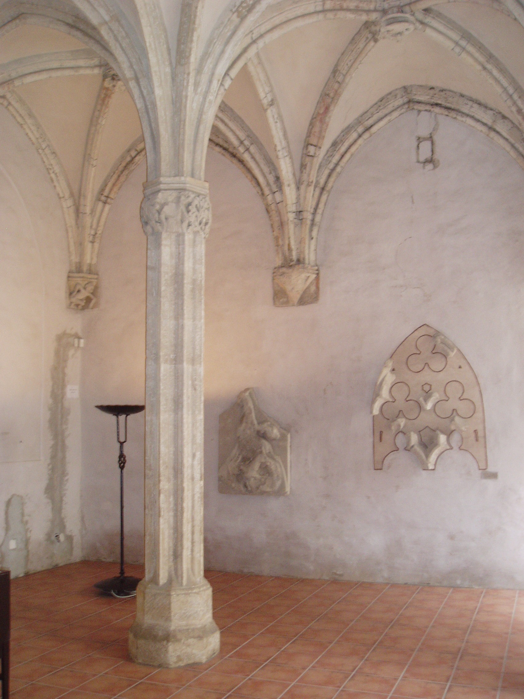 Nyilvános 829 | 1607 | Sopron, Fő tér: Kecske-templom - Káptalanterem | A Kecske–templomhoz a Templom utca felől kapcsolódik az egykori bencés rendház két udvart körülfogó, kétemeletes, nagy tömegű, de igénytelen külsejű épülete. A templommal együtt a ferencesek számára épült a XIV. században, majd 1802-ben a bencések kapták meg. E hajdani kolostor tartozéka a látogatók számára a templomból megközelíthető Káptalan–terem, Sopron város egyik legszebb gótikus műemléke. A háromhajós terem gótikus keresztboltozatait két karcsú nyolcszögletes pillér támasztja alá. A hajókhoz kelet felől egy–egy kápolnaszerű bővület csatlakozik, amelyeket pilléreken nyugvó csúcsíves árkád választ el a teremtől. A fénykép 2008 júniusában készült. Felh. irod.: Czellár Katalin: Sopron. 3. jav. kiad. Bp. Panoráma, 2000 |
