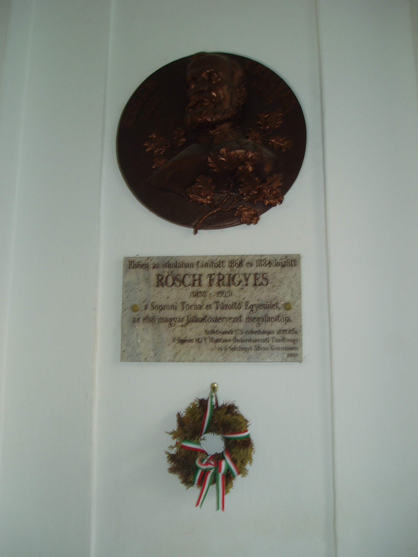 Nyilvános 1030 | 1503 | Sopron, Liszt Ferenc utca 1. | A Széchenyi István Gimnázium eredetileg reáliskola volt, amelyet 1850-ben alapítottak (lásd: Liszt Ferenc utca 2.). A Liszt Ferenc utca sarkán álló épületrészét, amelynek ezen a képen az udvari része látható, 1872-ben építették. A képen látható emléktáblát Rösch Frigyes (1832-1923) emlékére állították, aki 1868 és 1884 között itt tanított. Ő alapította meg a Soproni Torna és Tűzoltó Egyletet. A fénykép 2008 júniusában készült. Felh. irod.: http://szig.sopron.hu/ |