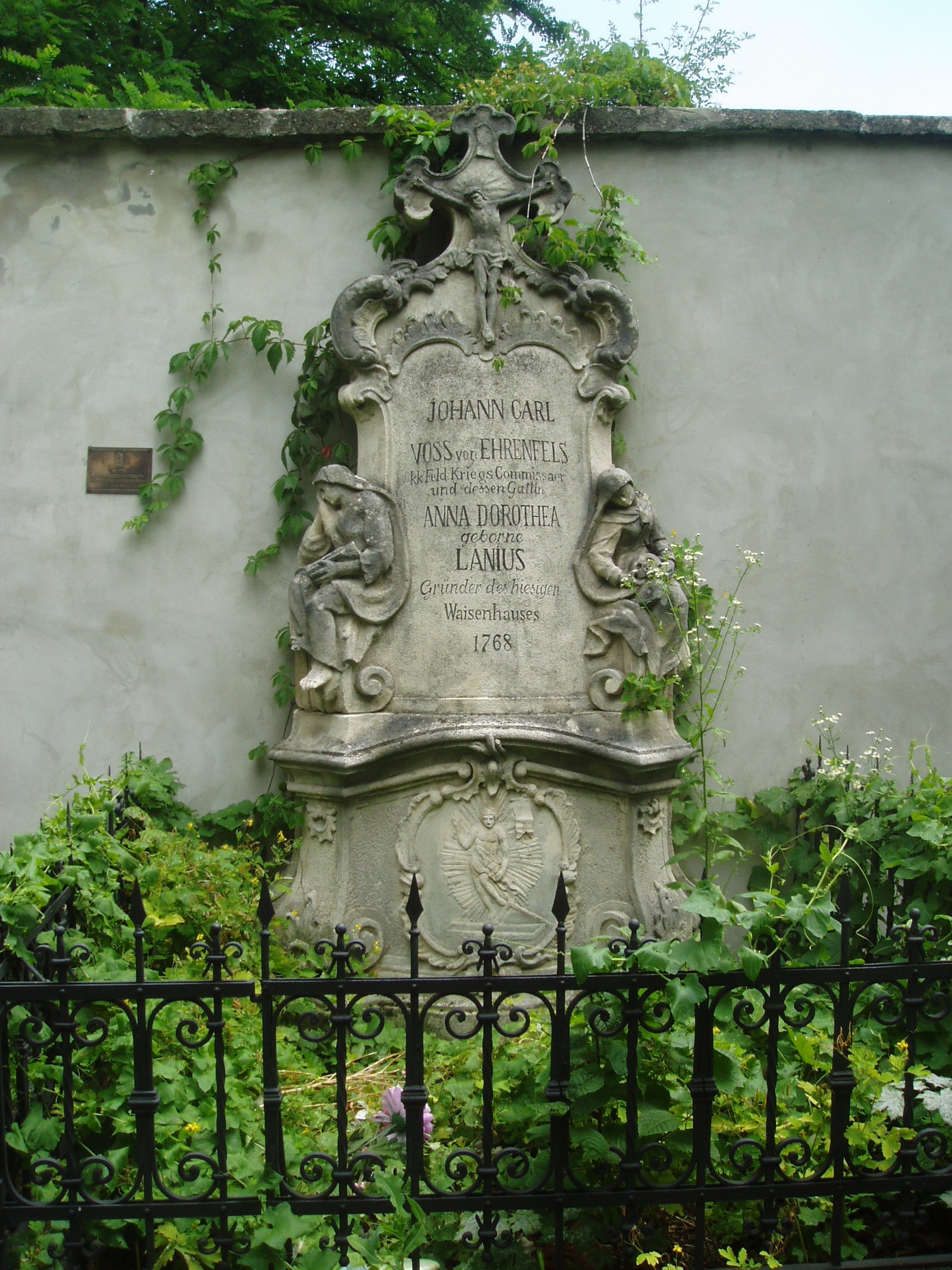 Nyilvános 969 | 1312 | Sopron, Szent Mihály utca: Szent Mihály-templom udvara | A Szent Mihály-templom körül egykor temető volt, várfallal körülvéve. Síremlékei közül néhány megmaradt. A képen a Voss-házaspáré látható 1768-ból. A kép 2008 júniusában készült. Felh. irod.: Czellár Katalin: Sopron. 3. jav. kiad. Bp. Panoráma, 2000 |