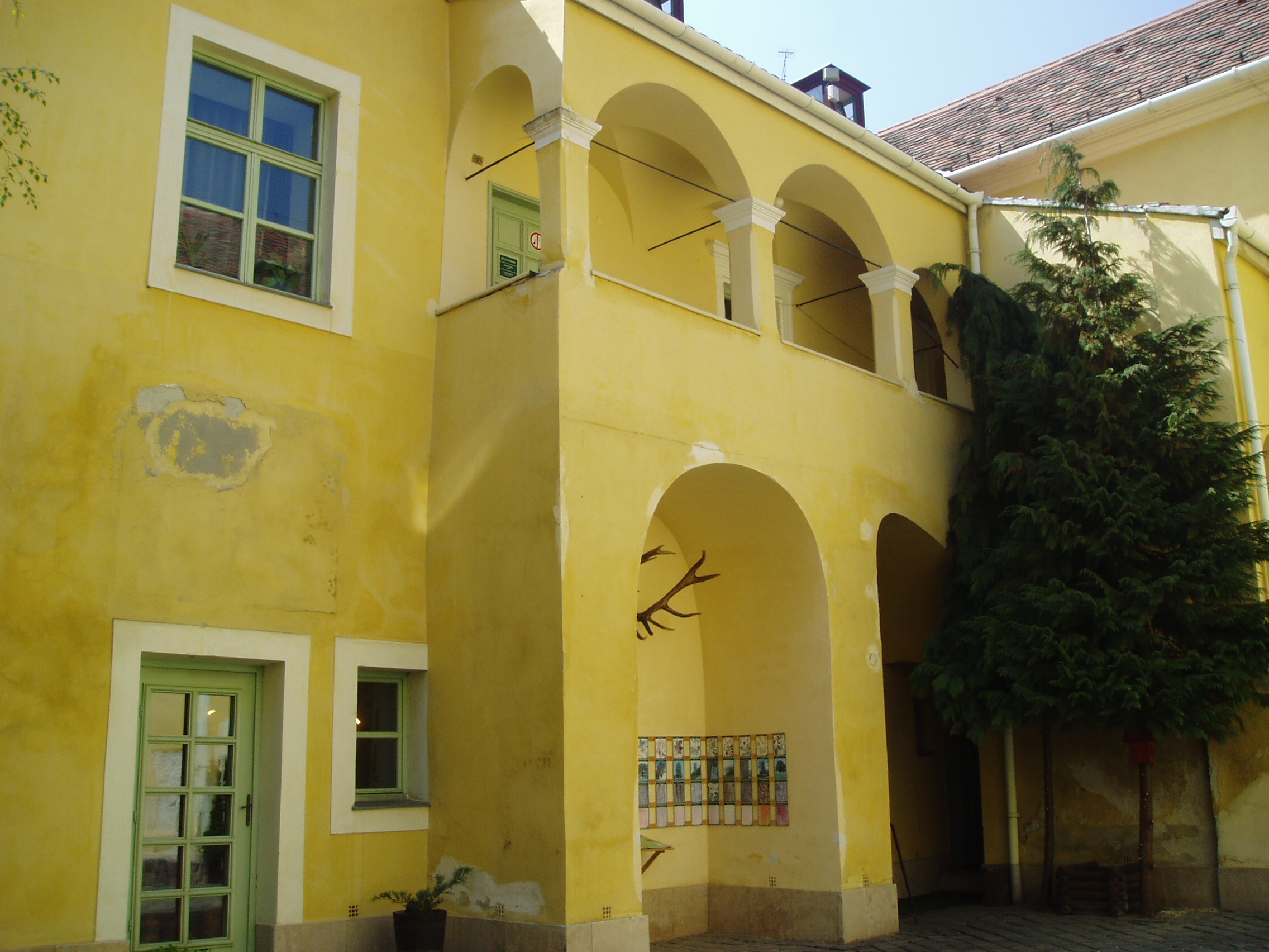 Nyilvános 963 | 1299 | Sopron, Templom utca 4. Esterházy-palota | A Templom utca 2. számú házhoz hasonlóan ez a középkori eredetű épület is az Esterházy család tulajdona volt 1614-től egészen 1945-ig, előtte pedig Oláh Miklós, a neves humanista érsek családjáé volt. A XVII. századból a kapu és az udvari loggia őrződött meg; homlokzata, amely mintegy folytatása a másik Esterházy–palotának, a XVIII. század közepéről származik. Ebben az épületben állapították meg 1921-ben az antanthatalmak megbízottjai a Sopron és környékének sorsát eldöntő népszavazás eredményét. Az evangélikus templom harangozója hallotta meg elsőként a polgárok közül a jó hírt, s ő kezdte el örömében a harangozást, amihez azután Sopron többi temploma is csatlakozott. A kép 2008 júniusában készült. Felh. irod.: Czellár Katalin: Sopron. 3. jav. kiad. Bp. Panoráma, 2000 |
