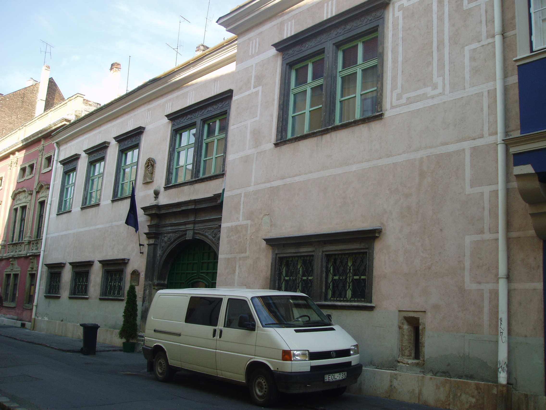 Nyilvános 967 | 1316 | Sopron, Templom utca 4. Esterházy-palota | A Templom utca 2. számú házhoz hasonlóan ez a középkori eredetű épület is az Esterházy család tulajdona volt 1614-től egészen 1945-ig, előtte pedig Oláh Miklós, a neves humanista érsek családjáé volt. A XVII. századból a kapu és az udvari loggia őrződött meg; homlokzata, amely mintegy folytatása a másik Esterházy–palotának, a XVIII. század közepéről származik. Ebben az épületben állapították meg 1921-ben az antanthatalmak megbízottjai a Sopron és környékének sorsát eldöntő népszavazás eredményét. Az evangélikus templom harangozója hallotta meg elsőként a polgárok közül a jó hírt, s ő kezdte el örömében a harangozást, amihez azután Sopron többi temploma is csatlakozott. A kép 2008 júniusában készült. Felh. irod.: Czellár Katalin: Sopron. 3. jav. kiad. Bp. Panoráma, 2000 |