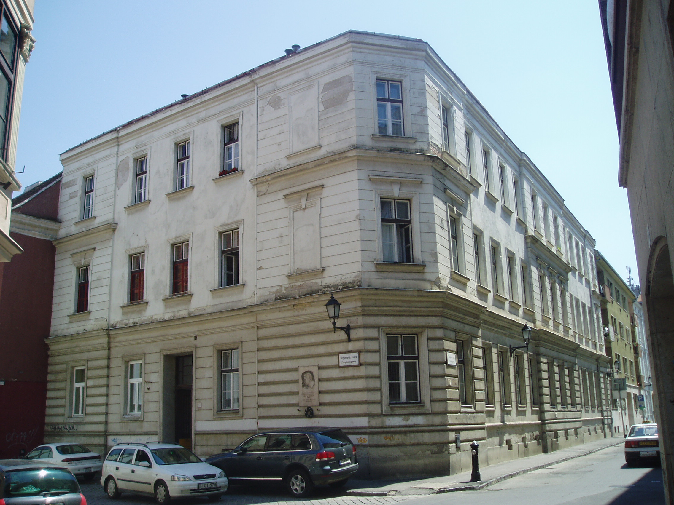Nyilvános 981 | 1731 | Templom utca 23. | Egykor ezen a helyen állt a neológ zsinagóga, amelyet Schámár János épített neoreneszánsz stílusban. Első és utolsó rabbija dr. Pollák Miksa (1868-1944) volt, aki történészként megírta a soproni zsidóság történetét. A mostani lakóházat Winkler Oszkár tervezte, 1960-ban épült fel. A neológ zsinagóga emléktáblája mellett az épületen egy másik tábla Pap Károly író alakját idézi fel, aki 1897. szeptember 24-én itt született, Pollák Miksa fiaként. A magyar irodalom egyik legeredetibb hangú prózaírója a buchenwaldi haláltáborban pusztult el. A kép 2008 júniusában készült. Felh. irod.: Czellár Katalin: Sopron. 3. jav. kiad. Bp. Panoráma, 2000 Hegedűs Géza: A magyar irodalom arcképcsarnoka. Bp. Trezor, 1992 |