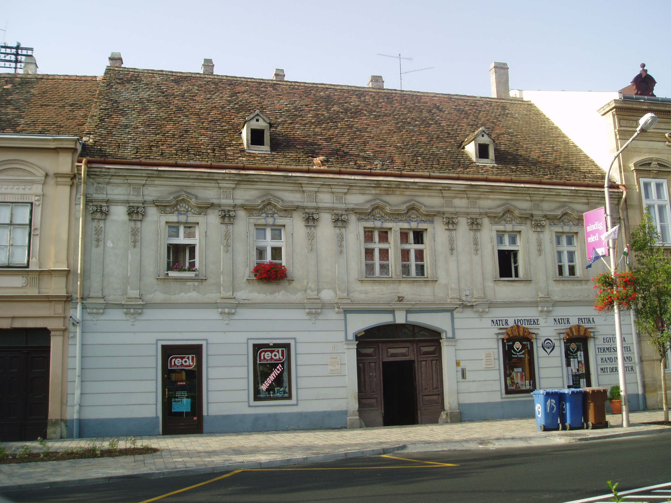 Nyilvános 945 | 1332 | Sopron, Várkerület 13. Pócza-ház | Egy korábbi földszintes lakóház átépítésével mai alakját a XVIII. század közepén kapta. Egyik emeleti szobájának mennyezetét 1740-1750 körül készült stukkódísz ékesíti. A kép 2008 júniusában készült. Felh. irod.: Czellár Katalin: Sopron. 3. jav. kiad. Bp. Panoráma, 2000 |