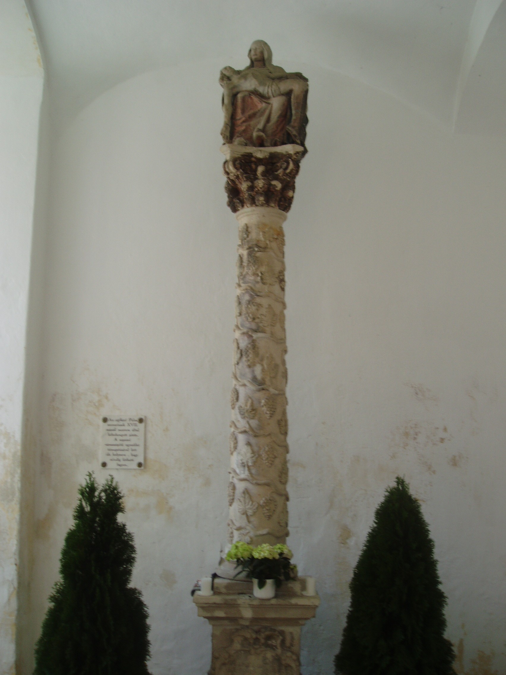 Nyilvános 1007 | 1563 | Sopronbánfalva: Kolostorhegy út: Karmelita templom és kolostor | Sopronbánfalva fölött a Sopronból Brennbergbányára vezető út déli oldán magas domb emelkedik. A dombot uraló gótikus eredetű, első formájában a XV. század végén épült templom és a hozzá csatlakozó barokk kolostorszárnyak eredetileg pálos szerzetesek, majd karmelita apácák otthona volt. Az épületegyüttest a település központjával a meredek domboldalban egyenesen húzódó díszes lépcső köti össze, amelyet karmelita-, vagy pálos lépcsőként ismer a köztudat. A lépcső hét lépcsőkarból és hét pihenőből áll. A pihenőkön, a baluszteres mellvéden jobbról-balról egy-egy szent kőszobra áll. A kép 2008 júniusában készült. Felh. irod.: Czellár Katalin: Sopron. 3. jav. kiad. Bp. Panoráma, 2000 |