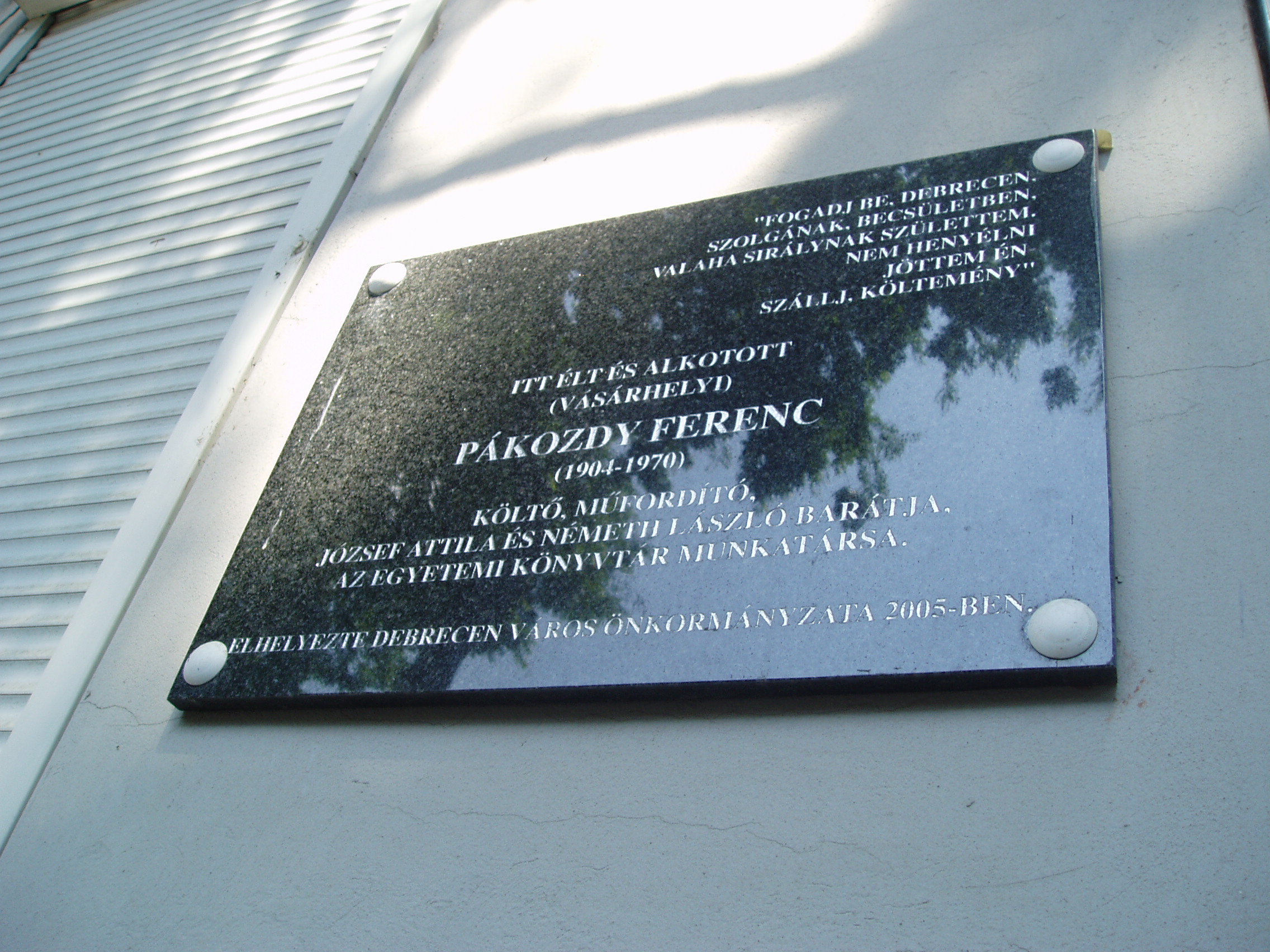 Nyilvános 1045 | 1645 | Debrecen, Darabos utca 61. | Mint az épületen elhelyezett fekete márványtáblán olvasható, ebben a házban élt és alkotott Pákozdy Ferenc (1904-1970) költő, műfordító, az Egyetemi Könyvtár munkatársa. Orvosnak készült, majd jogot hallgatott, jog- és államtudományi doktorátust szerzett. 1928–1944 között újságíró volt különböző lapoknál. 1945 után szülővárosában, Hódmezővásárhelyen dolgozott. 1952-től élt Debrecenben. A harmincas években József Attila pártfogója és értő kritikusa volt, költészete mellett a Külvárosi éj című verséről írott recenziójában állt ki (megjelent a hódmezővásárhelyi Hétfői Újságban 1933. jan. 2.án). A fénykép 2006 júniusában készült. Felh. irod.: Magyar életrajzi lexikon |