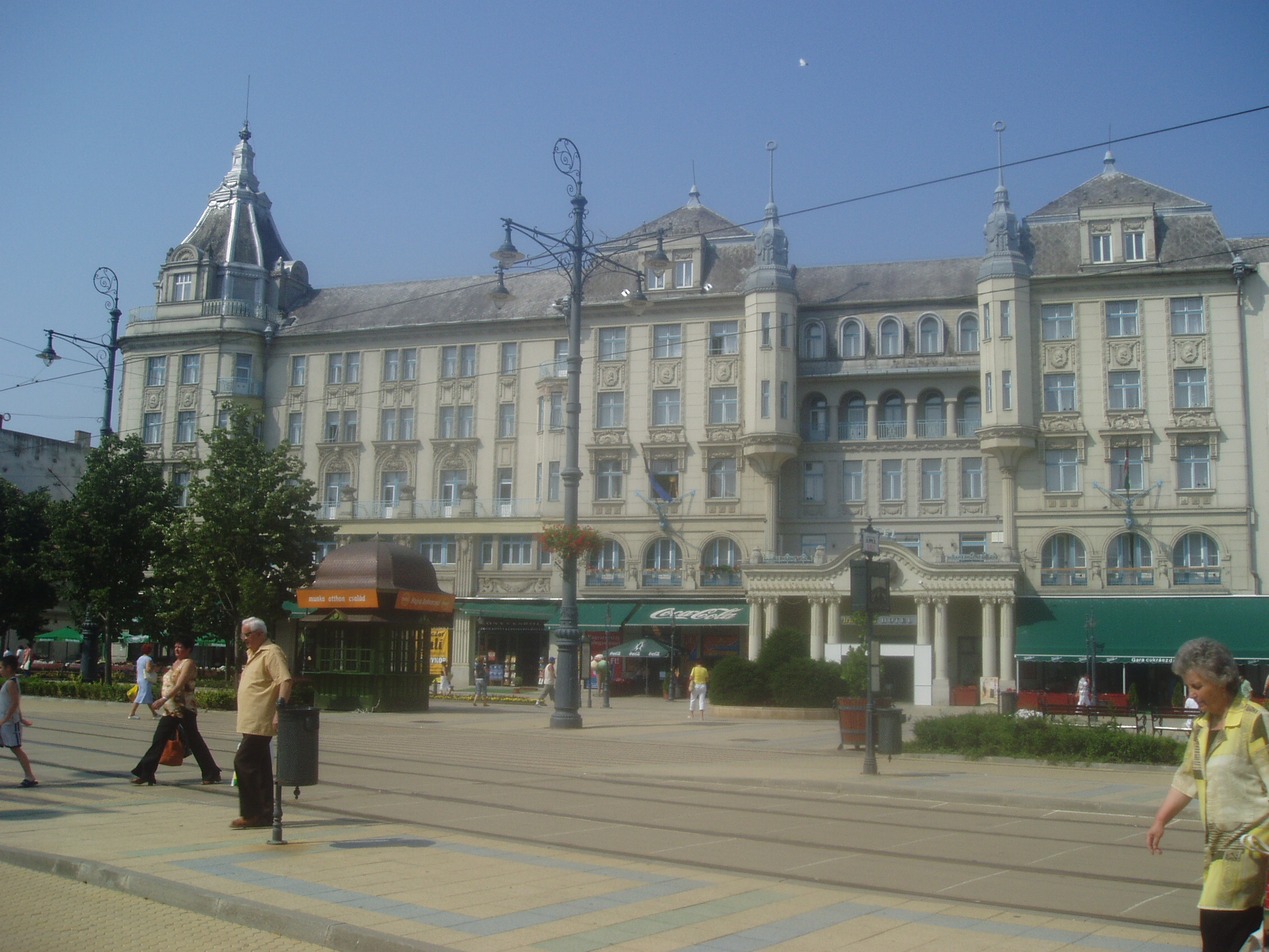 Nyilvános 1290 | 1954 | Debrecen, Piac utca 11-15. Arany Bika Szálloda | A szecessziós épületegyüttes 1913–1915 között épült Hajós Alfréd és Villányi Lajos tervei szerint. Új szárnyát 1976-ban építették hozzá. A négyemeletes főépület homlokzatán olasz kőfaragók által készített szecessziós plasztikák láthatók. A szálloda előterének két oldalát Józsa János színes üvegablakai díszítik. A régi és új szárnyat összekötő hallban egy rokokó pár életnagyságú szobra mellett vezet fel a lépcsősor az egykori díszteremhez. A ma Bartók Béláról elnevezett terem Debrecen 1500 férőhelyes, legnagyobb előadóterme. A tükörteremben Benyovszky István és Veres Géza festményei régi debreceni és hortobágyi életképeket idéznek fel. A mai Aranybika szálló helyén már a XVI. század végén vendégfogadó állt. 1699-ben árverezték el Bika András debreceni polgár egykor itt állott családi házát (a szálloda róla kapta a nevét), s benne négy vendégszobát rendeztek be. A hamarosan szűknek bizonyult, s a Rákóczi–szabadságharc idején erősen meg is rongálódott régi épületre 1799-ben emeletet húztak, majd 1809-ben ismét átépítették. Ekkor készült el vasból vert, bikát ábrázoló cégére, amely 1878-ig hirdette a közönségnek a szálló létét. 1840 körül a földszinten kávéházat nyitotak. 1848-ban egy időre Nádor szállóra keresztelték, s felsőbb parancsra a Bach–korszakban is így hívták. Az öreg épületben számos nevezetes vendég lakott, többek között Széchenyi István, Vörösmarty Mihály, Wesselényi Miklós, Deák Ferenc, Petőfi, Bem tábornok. Nagy Sándor és vezérkara 1849. augusztus 2-án innét indult a csatatérre, ahol a maroknyi magyar sereg nem tudott ellenállni a többszörös túlerőnek. Így estére már Paszkievics herceg és vezérkara ütütt a Bikában tábort s ünnepelték a diadalt, míg Debrecen lakói bezárt házakban, lefüggönyzött ablakok mögött siratták az elveszett reményeket. A XIX. század végére már nemzetközi viszonylatban is jól ismert, patinás szálló kicsinek bizonyult, ezért Steindl Imre tervei szerint pompás új épületet emeltek. A szállodával egyidejűleg kávéháza is megnyílt, első vendége Jókai Mór volt. Az új, egyemeletes szállodaépület pezsgő központja lett Debrecen szellemi és társasági életének. A debreceni írók és művészek, valamint a fővárosból idelátogató barátaik gyakran találkoztak a „közvélemény–asztalnak” nevezett irodalmi törzsasztalnál. 1913-ban elkezdték ennek az épületnek a lebontását is, s a szálló mostani épülete 1915-re lett készen. Az 1920-as években gyakori vendége volt a Bikának Móricz Zsigmond (szobáját születésének évfordulóján emléktáblával jelölték meg) és tizenöt éven át lakott benne Oláh Gábor költő. 1944/45 telén a szálloda adott otthont az Ideiglenes Nemzetgyűlés, majd az Ideiglenes Kormány tagjainak. Felh. irod.: Papp Antal: Debrecen. Bp. Panoráma, 1976 Kovács Gergelyné: Debrecen. Bp. Panoráma, 1981 300 év históriája: egy polgárváros az Aranybikában. Debrecen, Pro Millennium, 1999 |